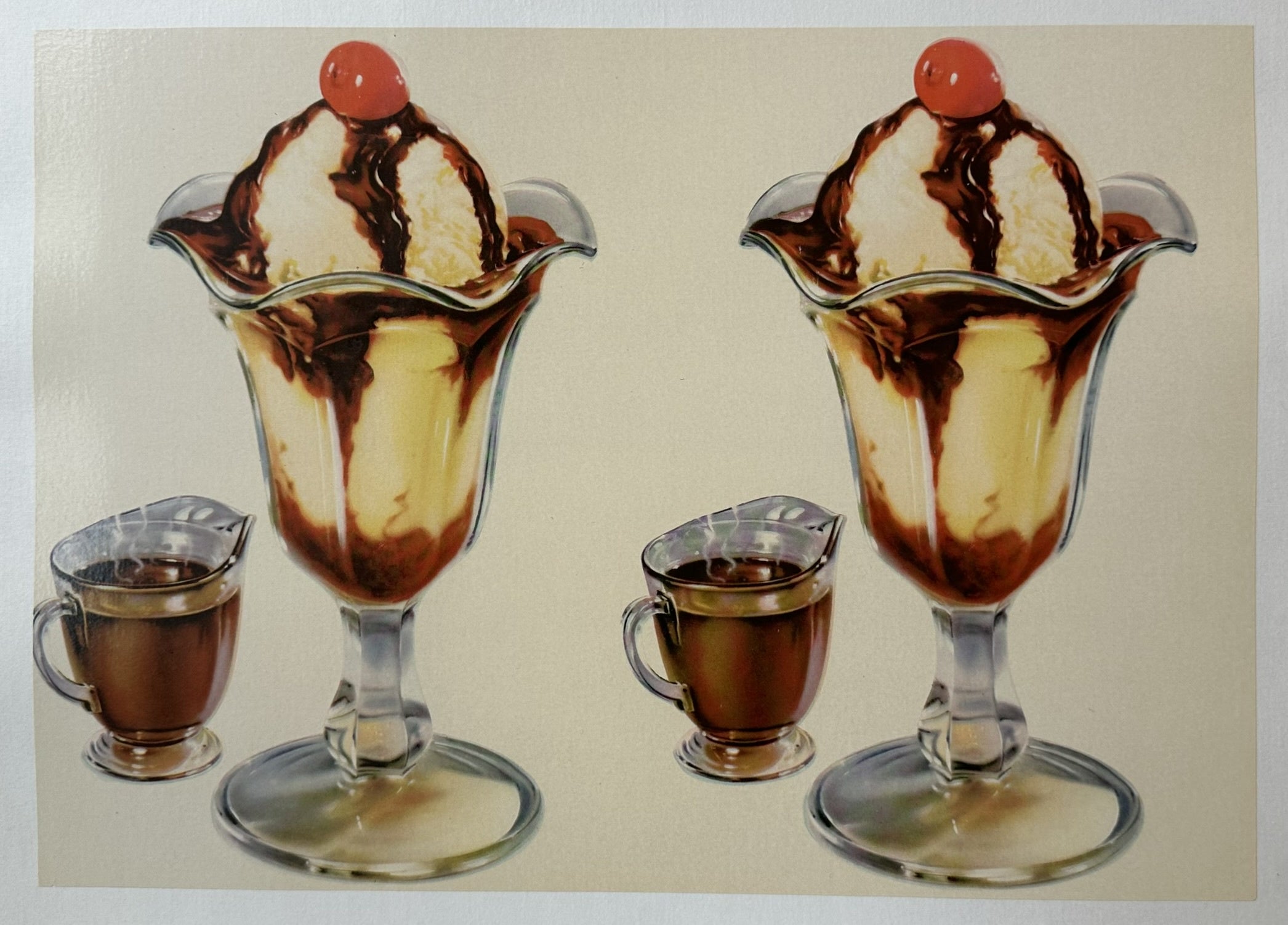 A horizontal poster with two identical prints of a steaming espresso next to a vanilla ice cream sundae. Part of a series of food from the 1950s, reminiscent of traditional American diner food.