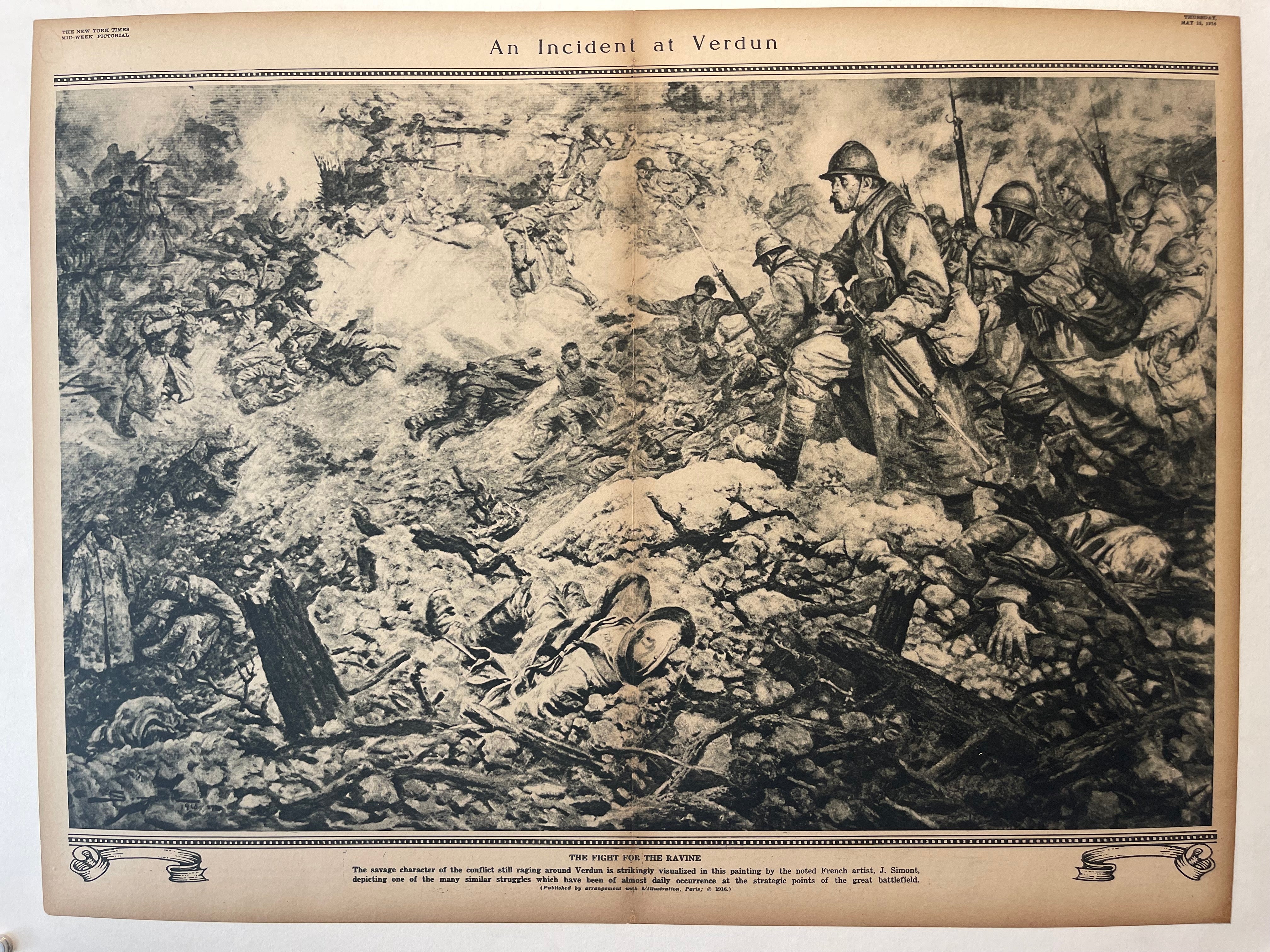 Published by arrangement with R/Illustration in Paris, this New York Times Mid-Week Pictorial from May 11, 1916 highlights the brutal conflict from Verdun. The Battle of Verdun was the longest fight in WWI and resulted in an incredibly high number of casualties. The NY Times Mid-Week Pictorial no longer runs, but was used to deliver news to the general public before mass visual media became available and popular.
