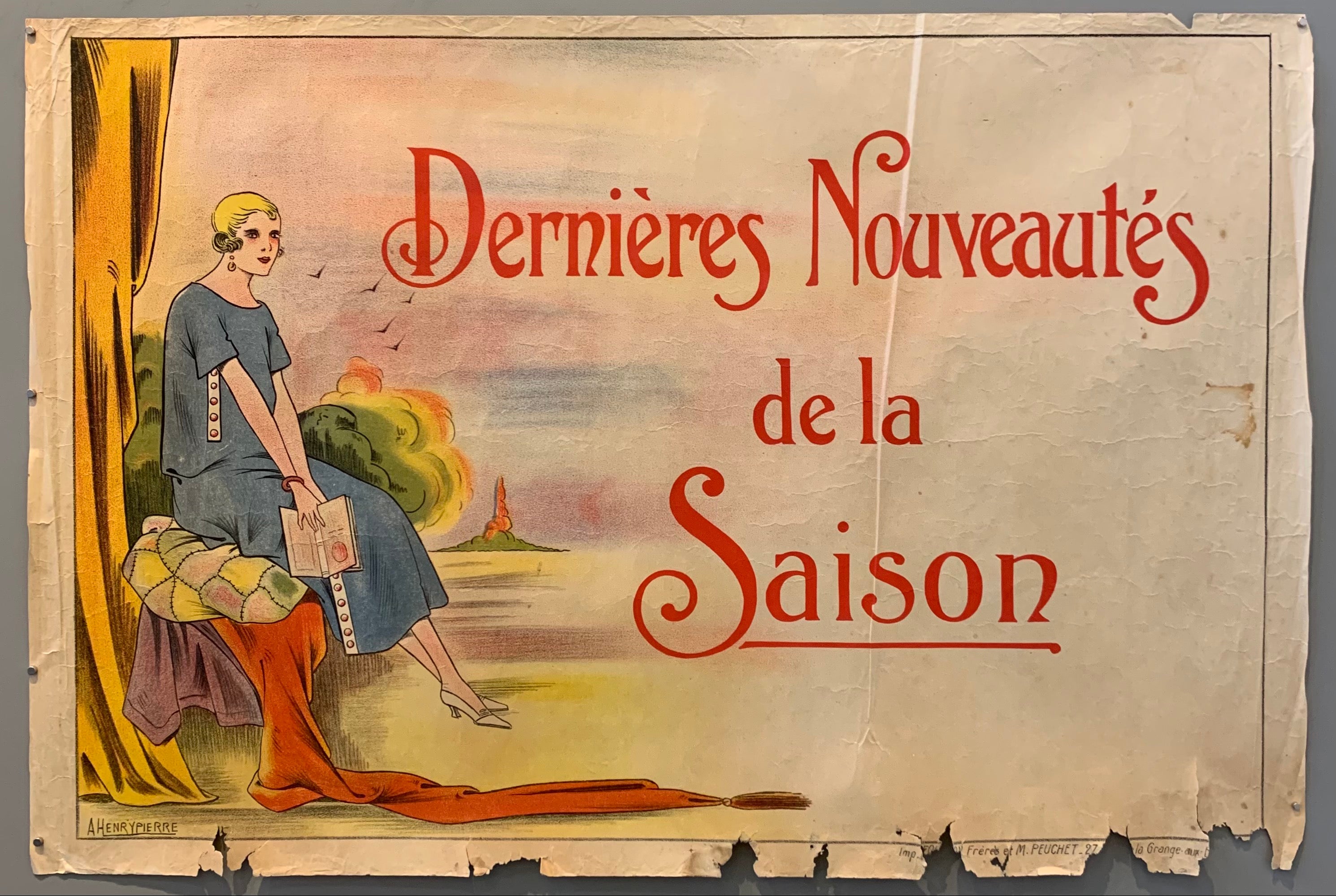 "Dernières Nouveautés de La Saison" or "Latest New Arrivals of the Season" this attractive Art Deco poster advertises a Parisian department store's latest wares. A lovely young woman with cropped blonde hair and gold earrings gazes softly at the viewer. She sits upon a seat that appears to be made of draped fabrics and textiles and she holds an open book on her knee. The whimsical black script enhances the poster's Art Deco allure, making this poster the perfect addition to any home.