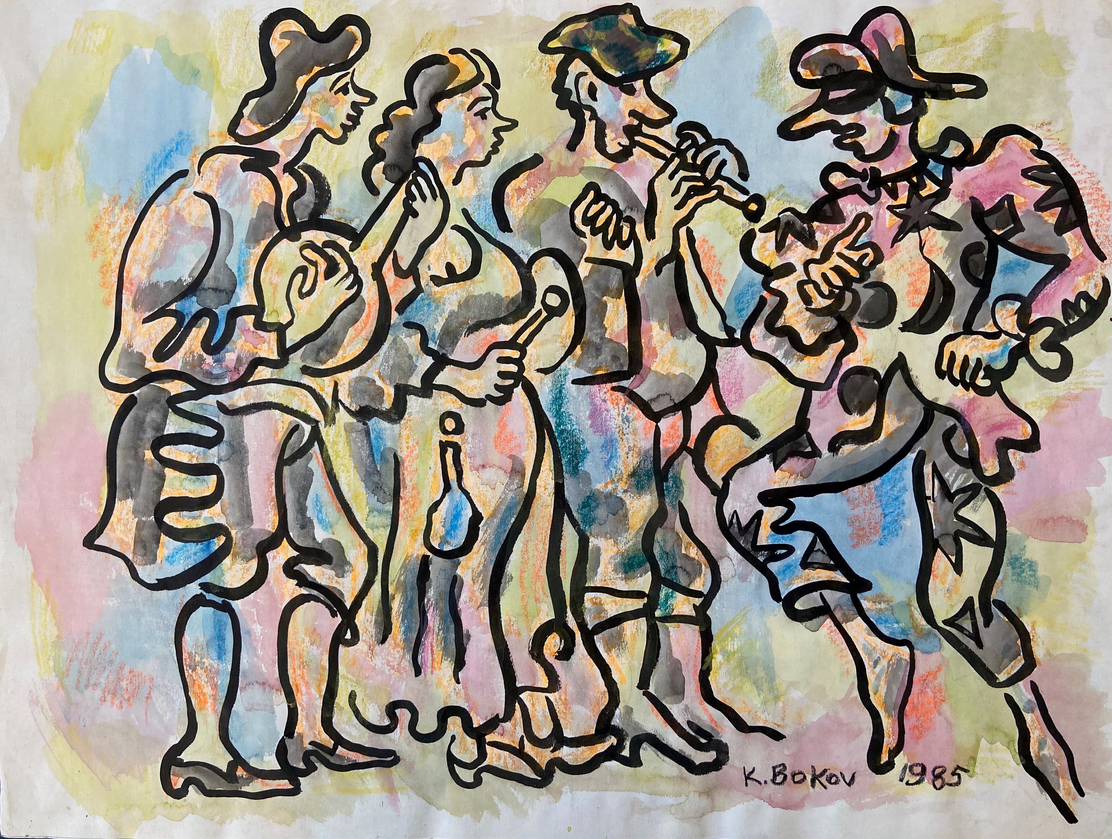 A delightfully funky oil stick painting of a musical circus troupe. The figures here are evocative of Picasso's many circus-themed paintings.