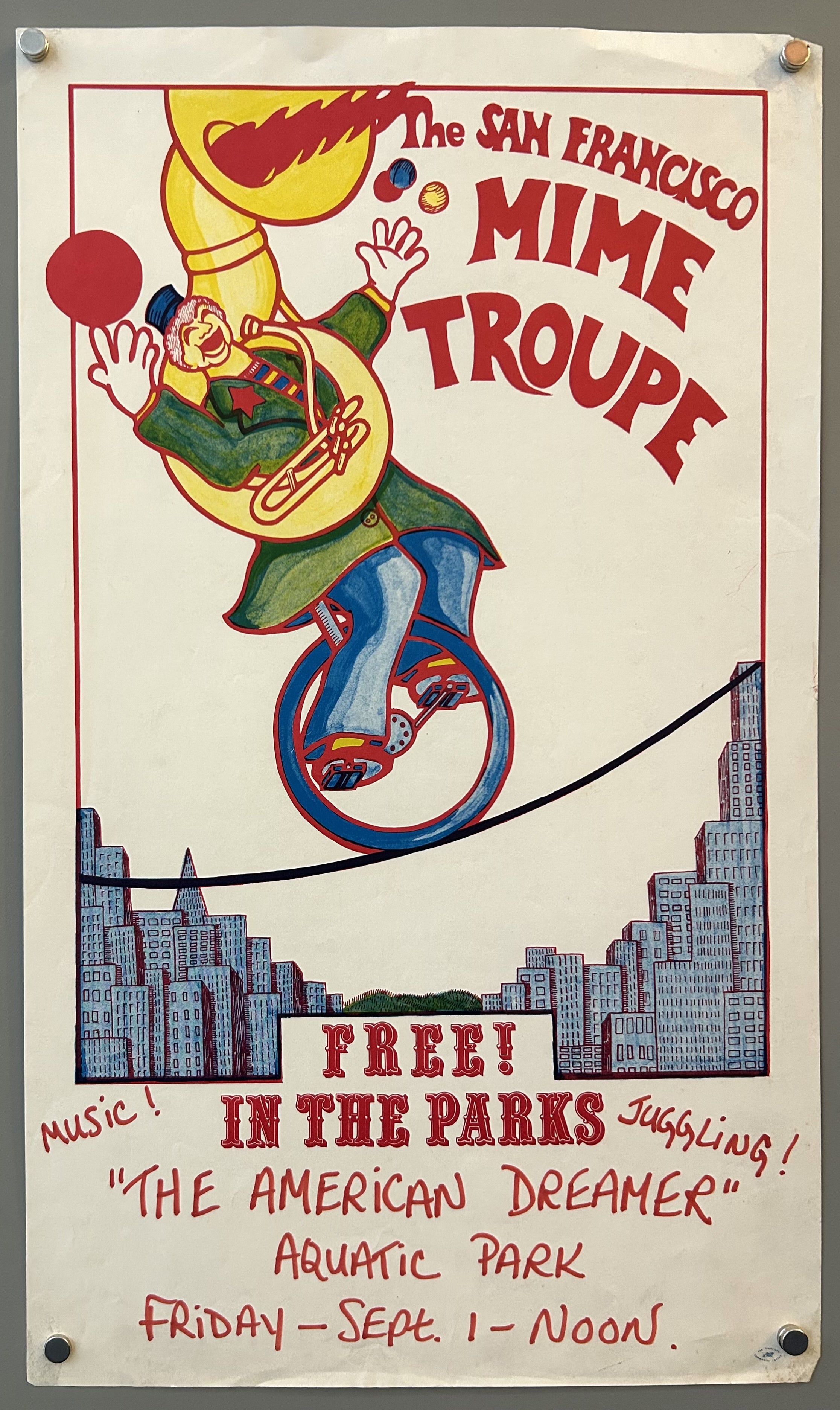 Promotional poster for a San Francisco Mime Troupe performance in the park.