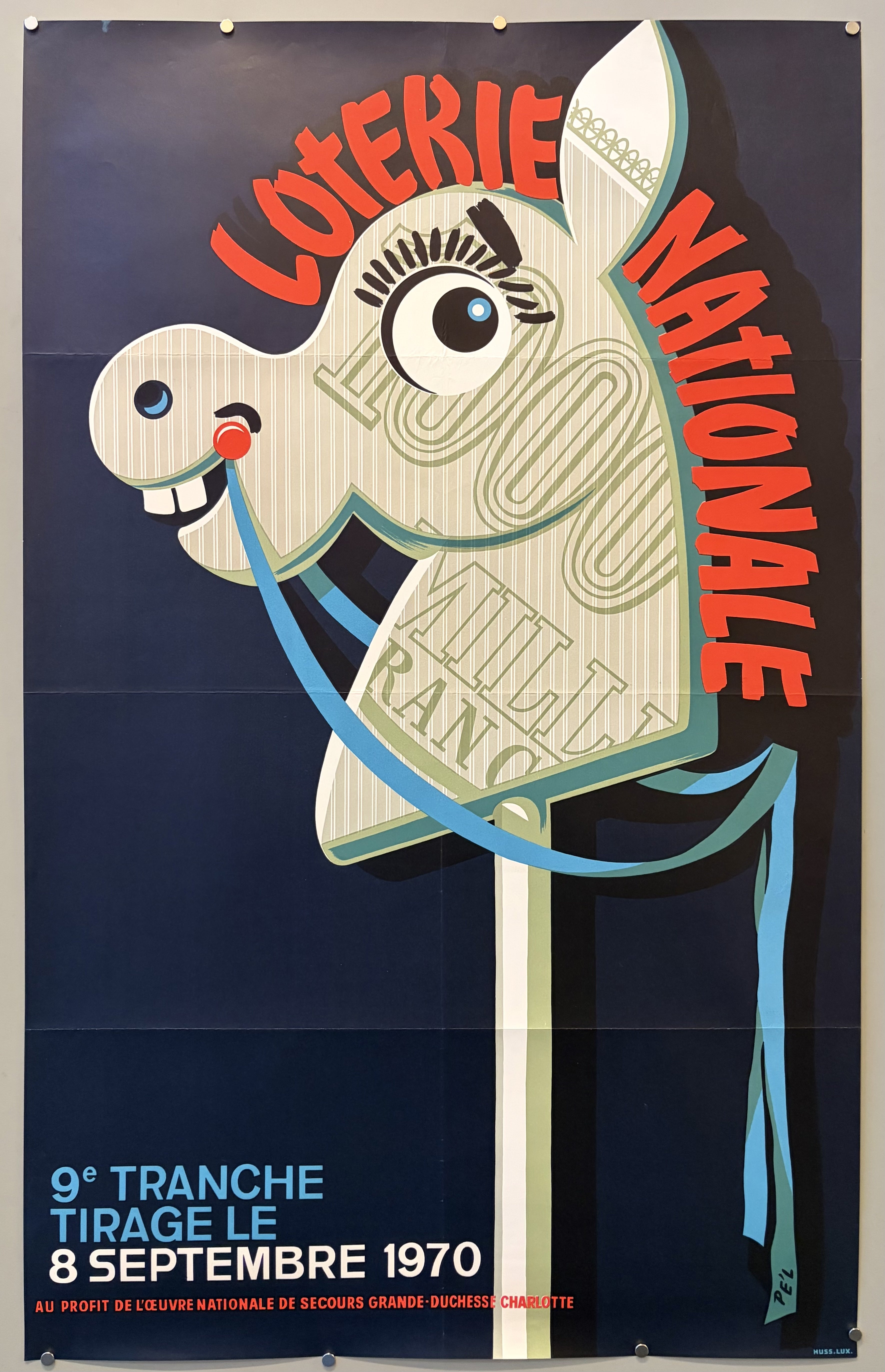 An original Loterie Nationale poster. The Luxembourgish National Lottery was known for producing whimsical and color-packed pieces, often by prominent poster artists, to be displayed on the street.