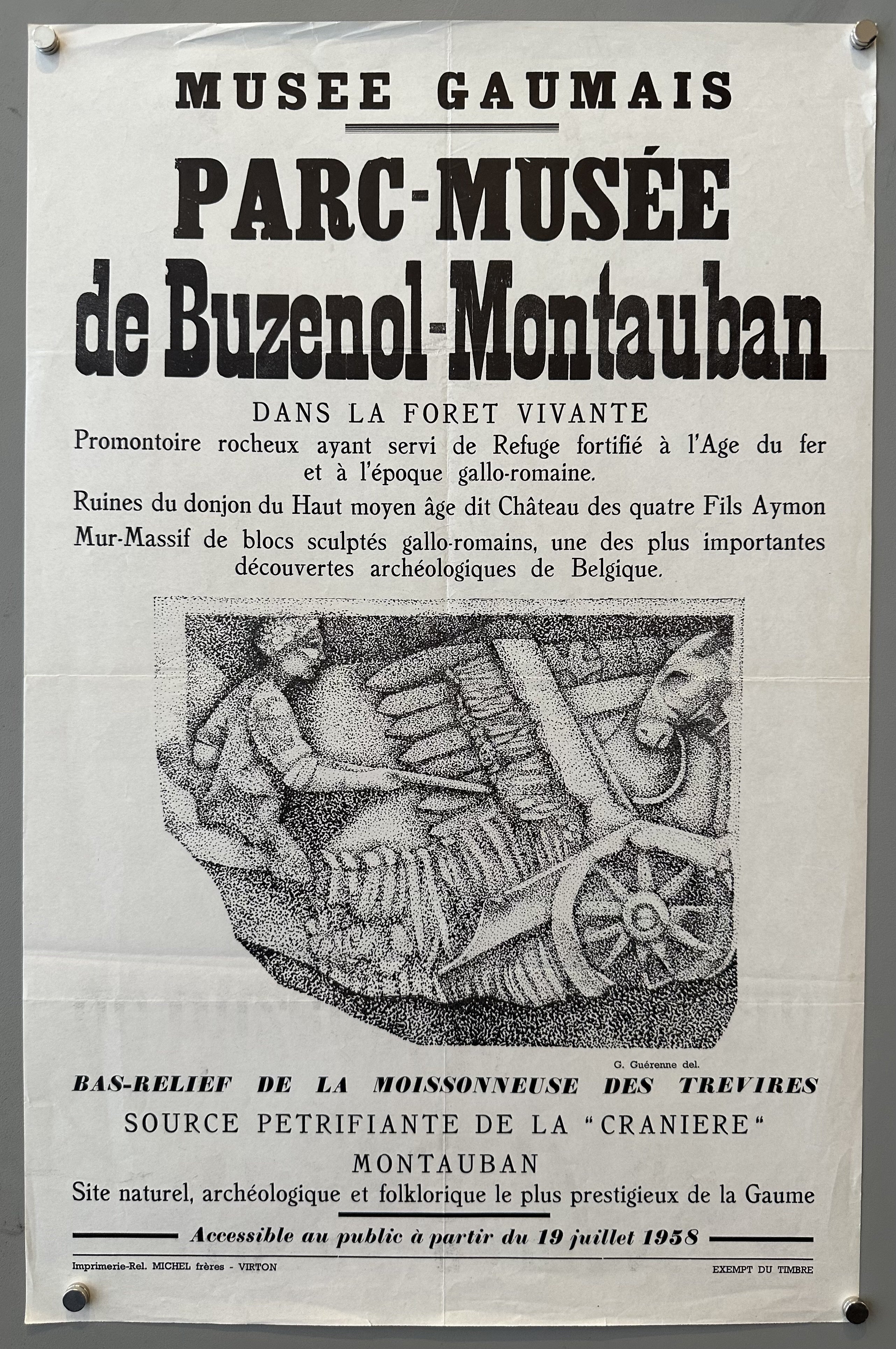 "Musée Gaumais / Parc-Musée de Buzenol-Montauban / Dans La Foret Vivante / Bas-Relief de la Moissonneuse des Trevires / Source Petrifiante de la 'Craniere' Montauban / Site naturel, archéologique et folklorique le plus prestigieux de la Gaume"
