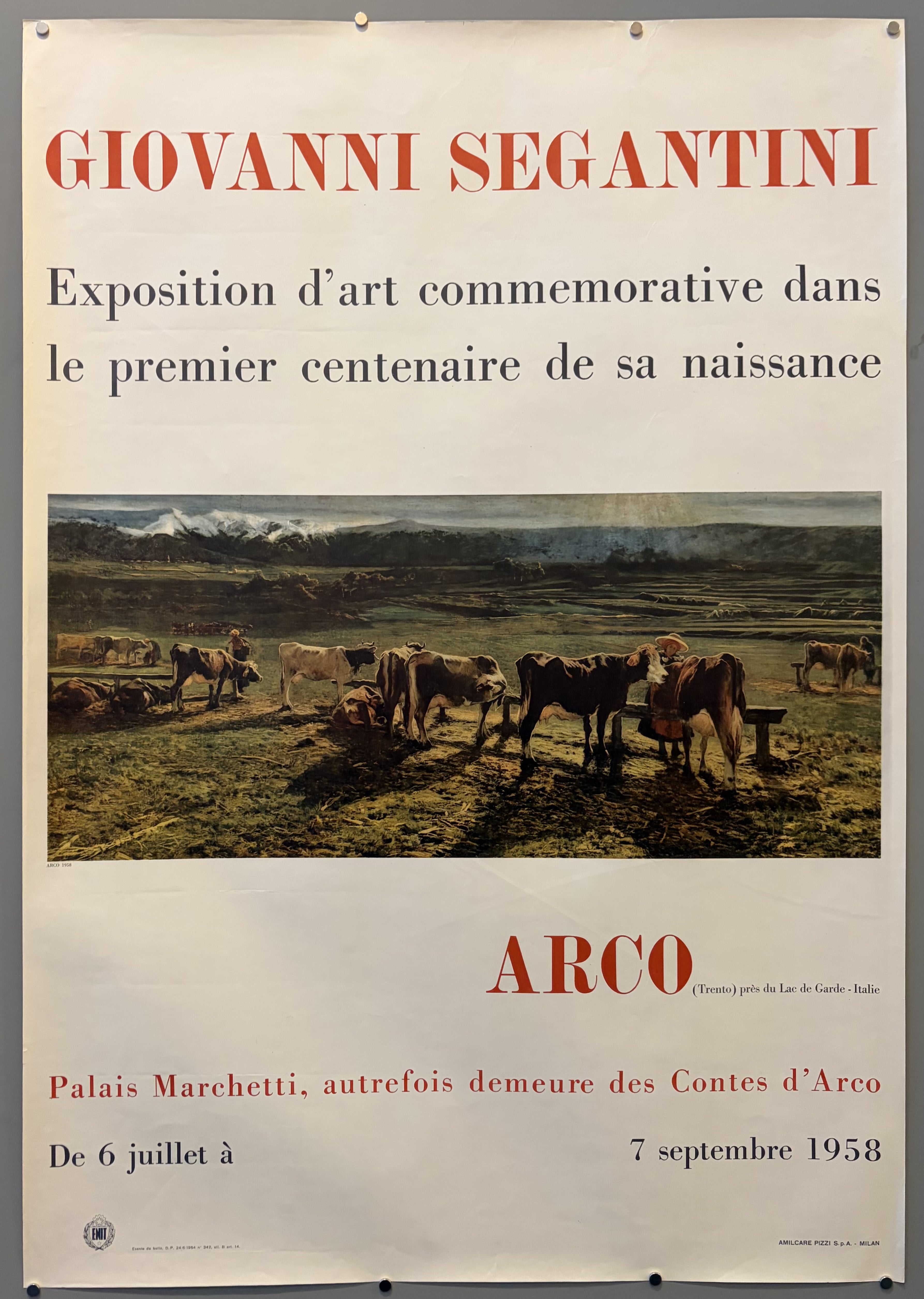 English translation: "Giovanni Segantini / Commemorative art exhibition in the first centenary of his birth / ARCO (Trento) near Lake Garda - Italy / Palazzo Marchetti, former residence of the Counts of Arco"