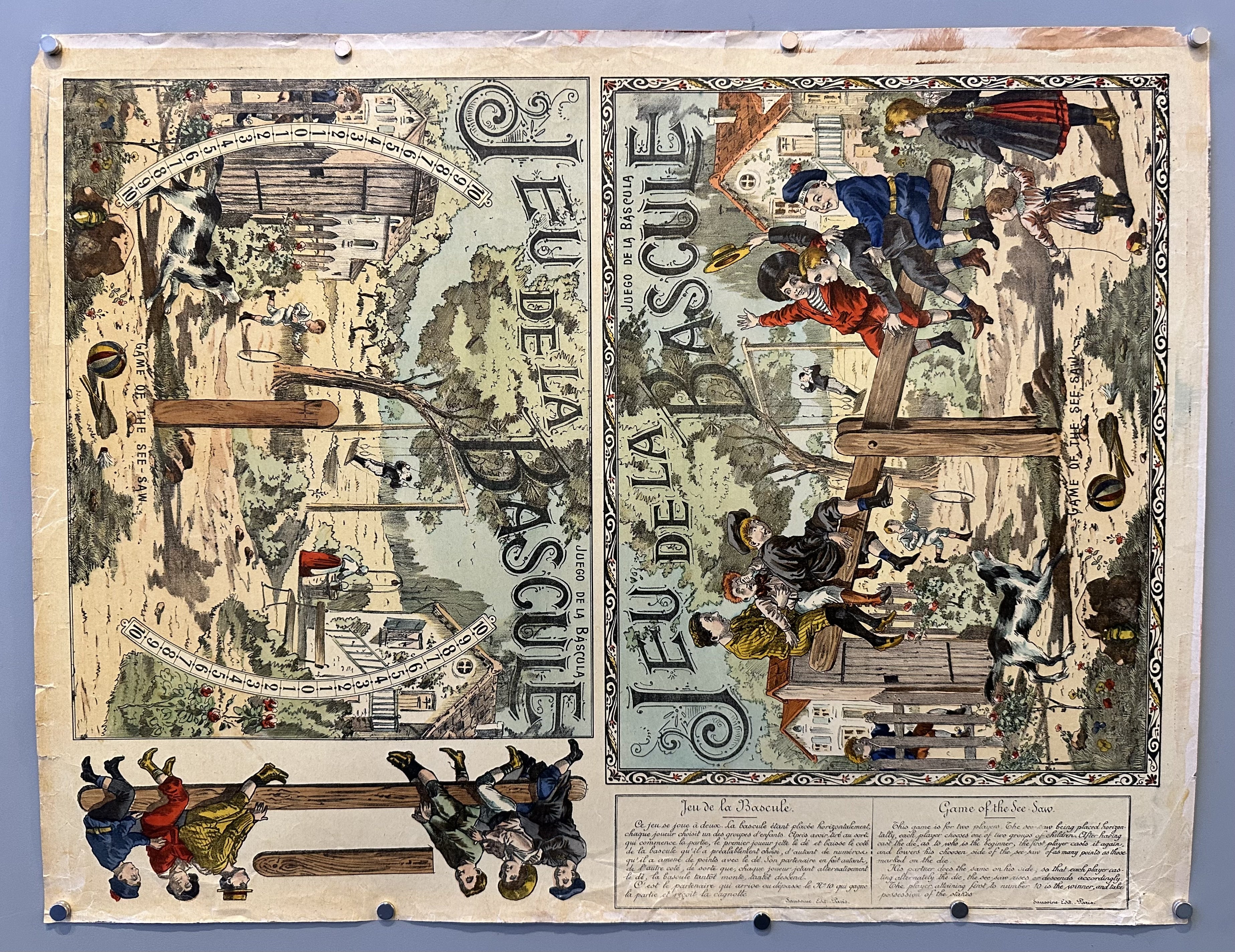 Vintage French board game featuring an illustration of children on a see saw and instructions. Most likely created by Jeux Saussine.