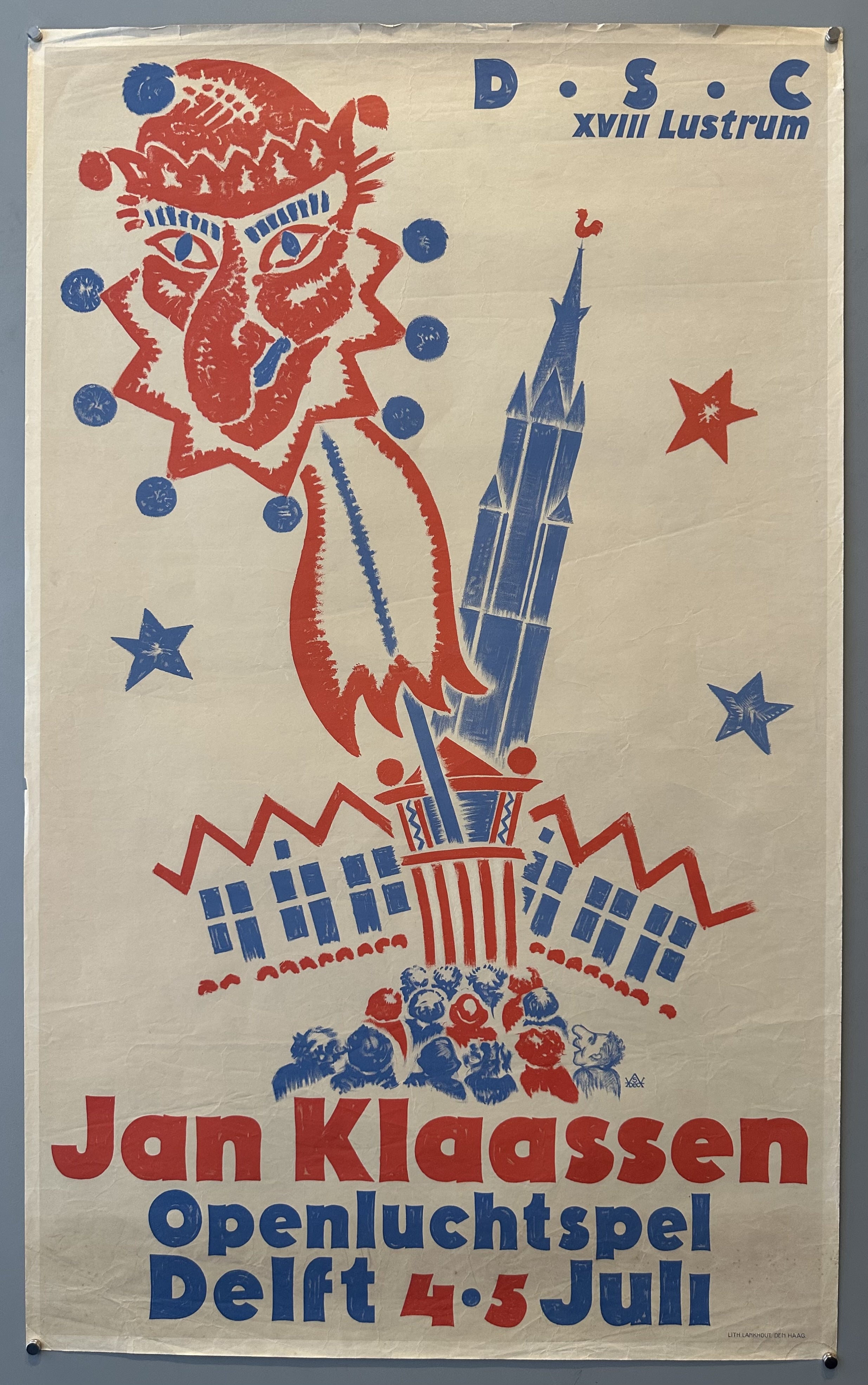A poster for a fair in Delft featuring a red and blue drawing of Jan Klaassen, a popular Dutch puppet.