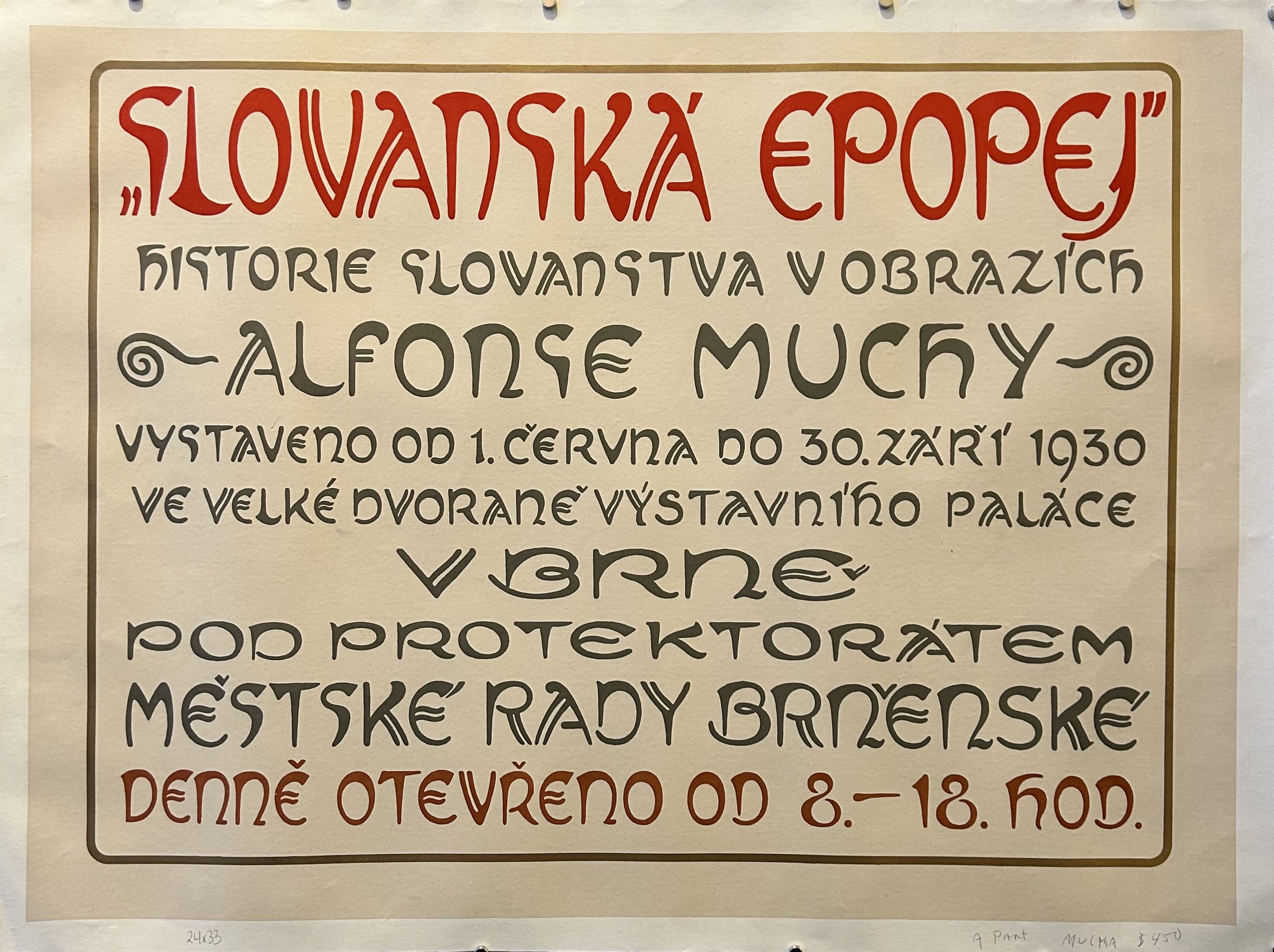 English translation: "THE SLOVAK EPOPE / History of the Slavs In Pictures / Alfons Mucha / Exhibited From June 1 To September 30, 1930 In The Great Hall Of The Exhibition Palace / In Brno / Under The Protectorate / Brno City Council / Open Daily From 8 am to 6 pm daily."