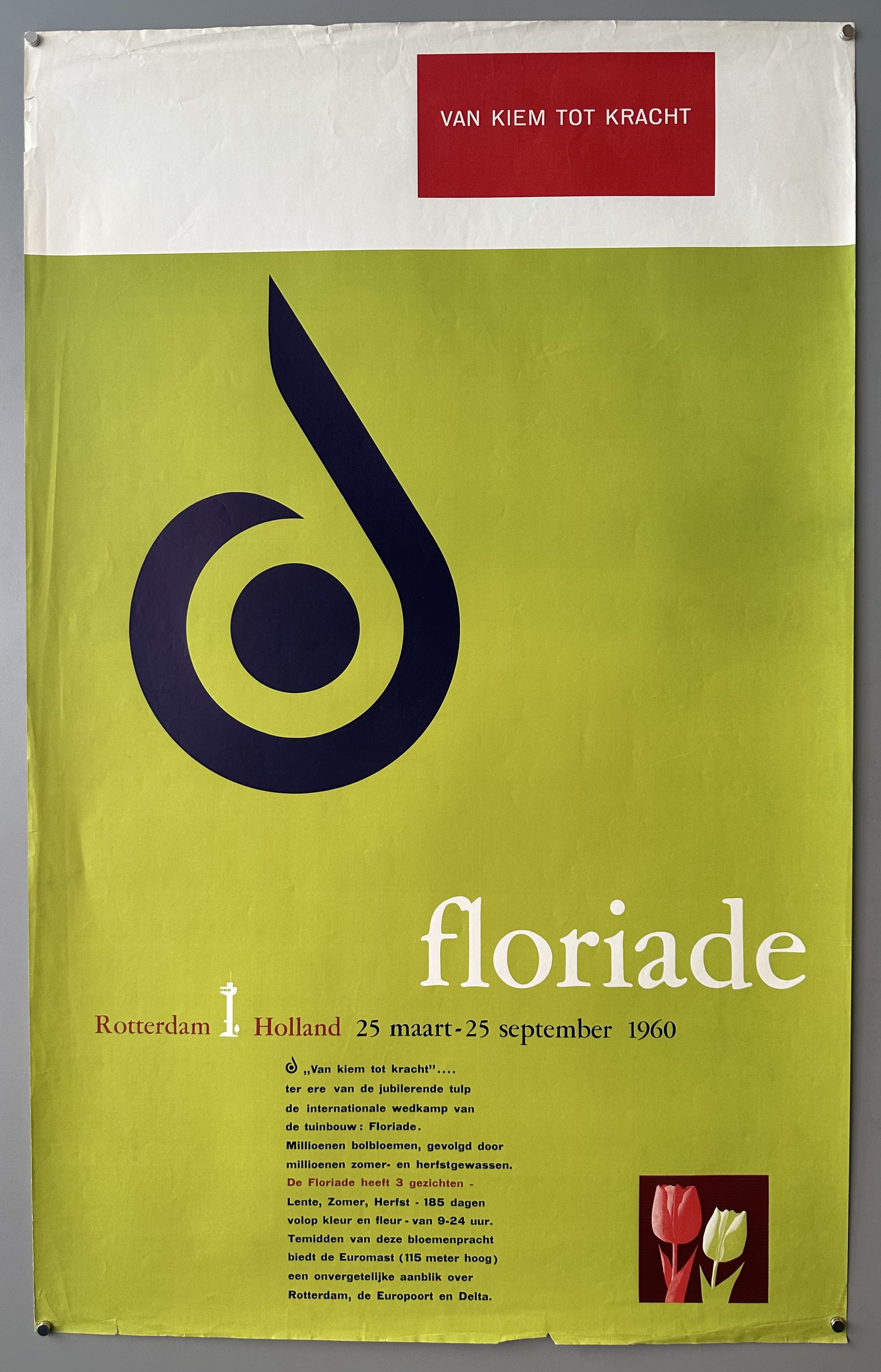 English translation: "From Germ to Strength / Floriade / Rotterdam Holland 25 March-25 September 1960 / 'From Germ to Strength'....in honour of the jubilee tulip the international competition of horticulture: Floriade. Millions of bulb flowers, followed by millions of summer and autumn crops. The Floriade has 3 faces - Spring, Summer, Autumn - 185 days full of colour and bloom - from 9-24 hours. In the midst of this floral splendor, the Euromast (115 metres high) offers an unforgettable view of Rotterdam, the Europoort and Delta"