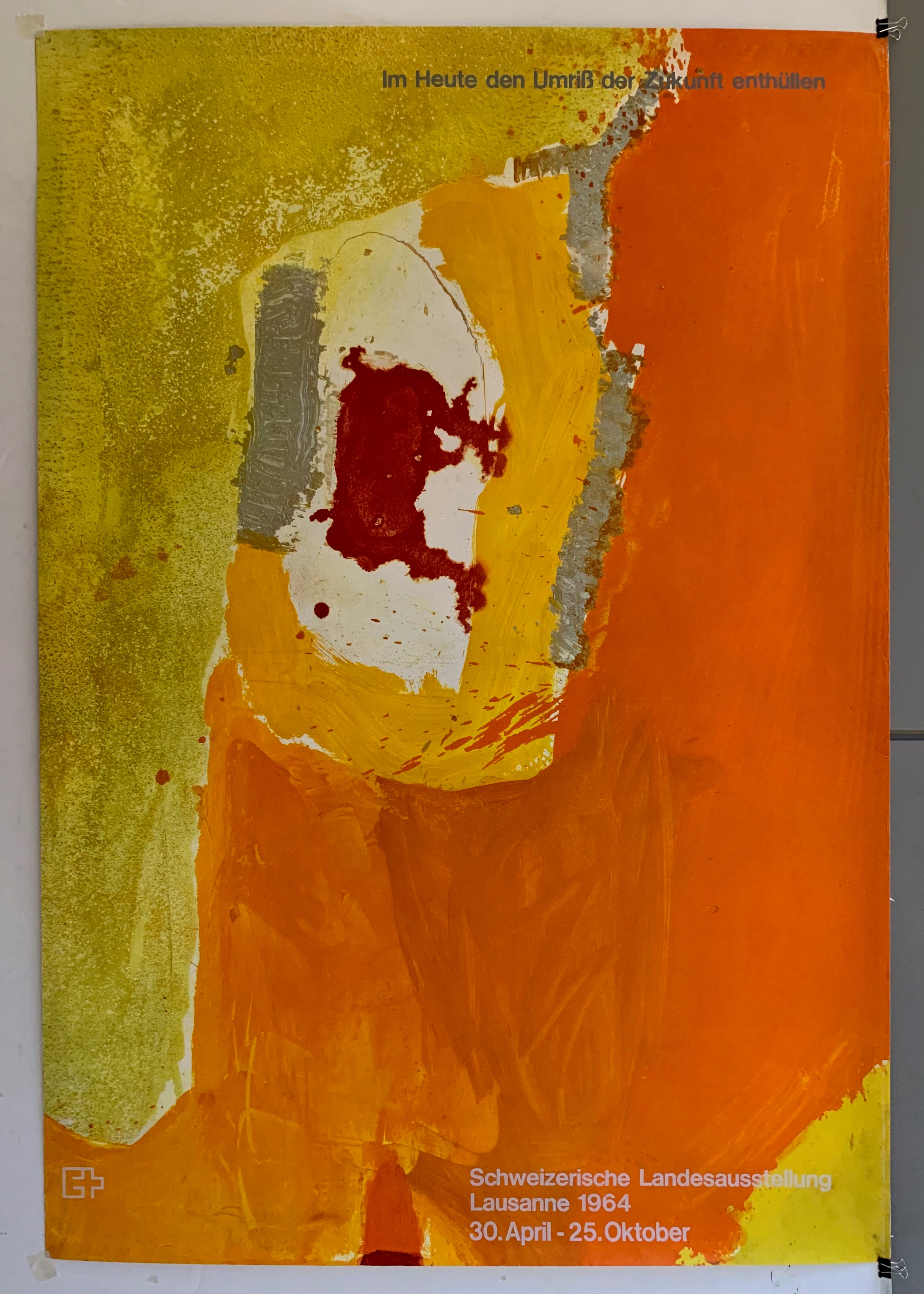 This beautiful original poster advertises an exhibition also known as Expo 64. It was an annual event showcasing architecture, art, innovation, and more, and was intended to portray all aspects of Switzerland as a country. The abstract painting style of this colorful poster is distinctive of its designer, Hans Falk. The mesmirizing mix of shades of orange and yellow fit into eachother like puzzel pieces. What an amazing piece!
