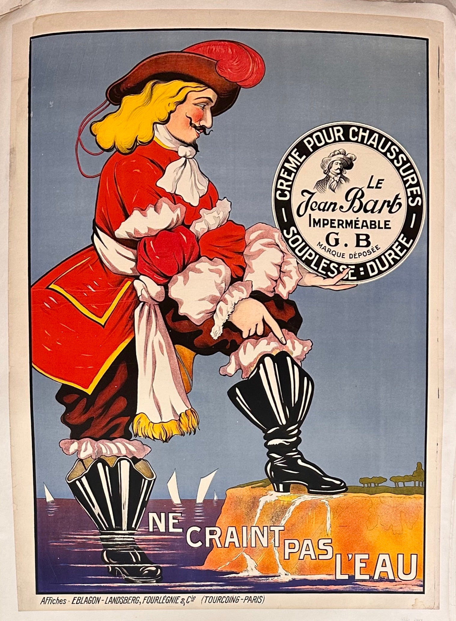 This poster for shoe polish bears the name and image of the historical sailor and Admiral of the French Navy, Jean Bart.