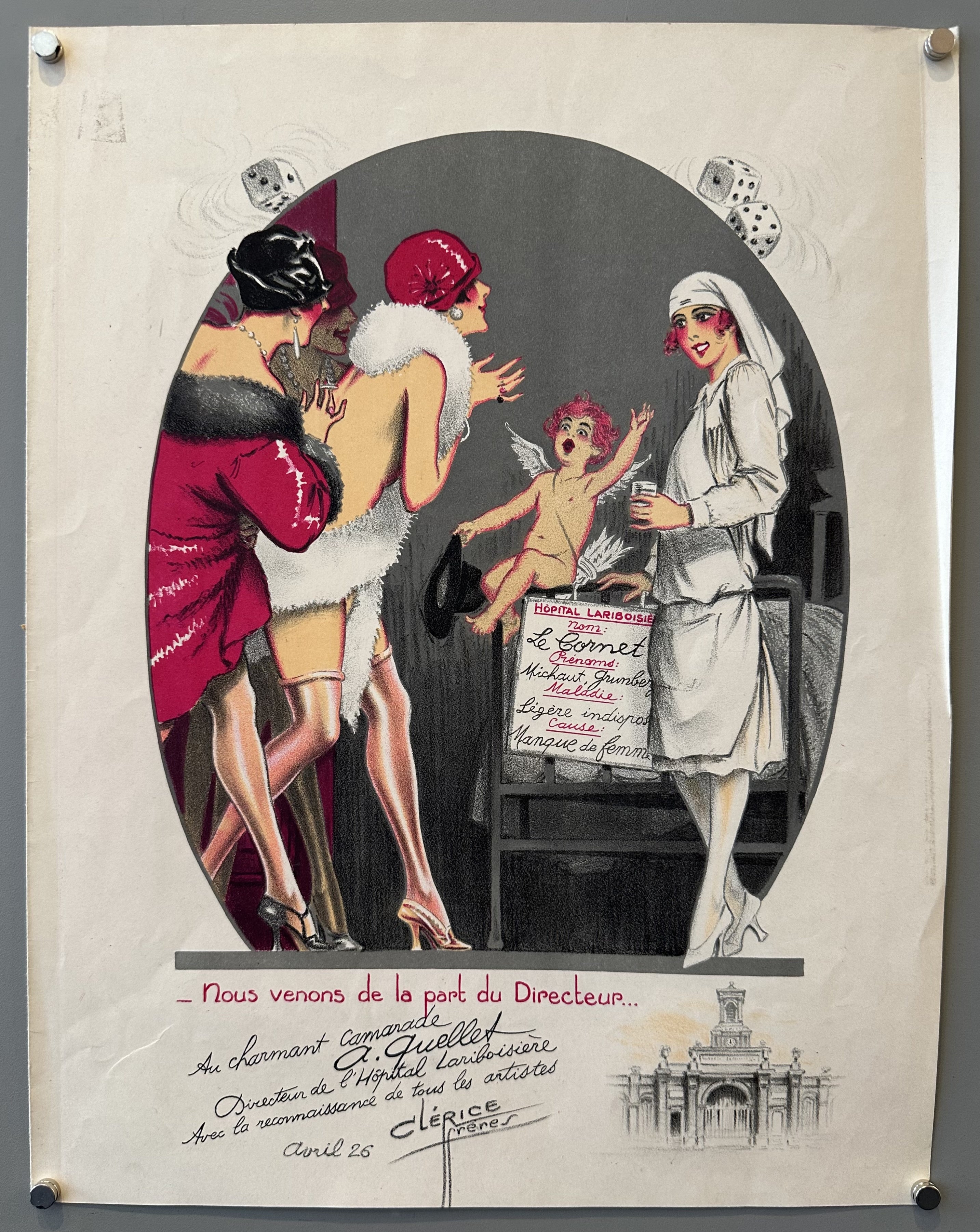 "Nous Venons de la Part du Directeur... Au charmant camarade A. Guillet Directeur de l'Hôpital Lariboisière avec la reconnaissance de tous les artistes"