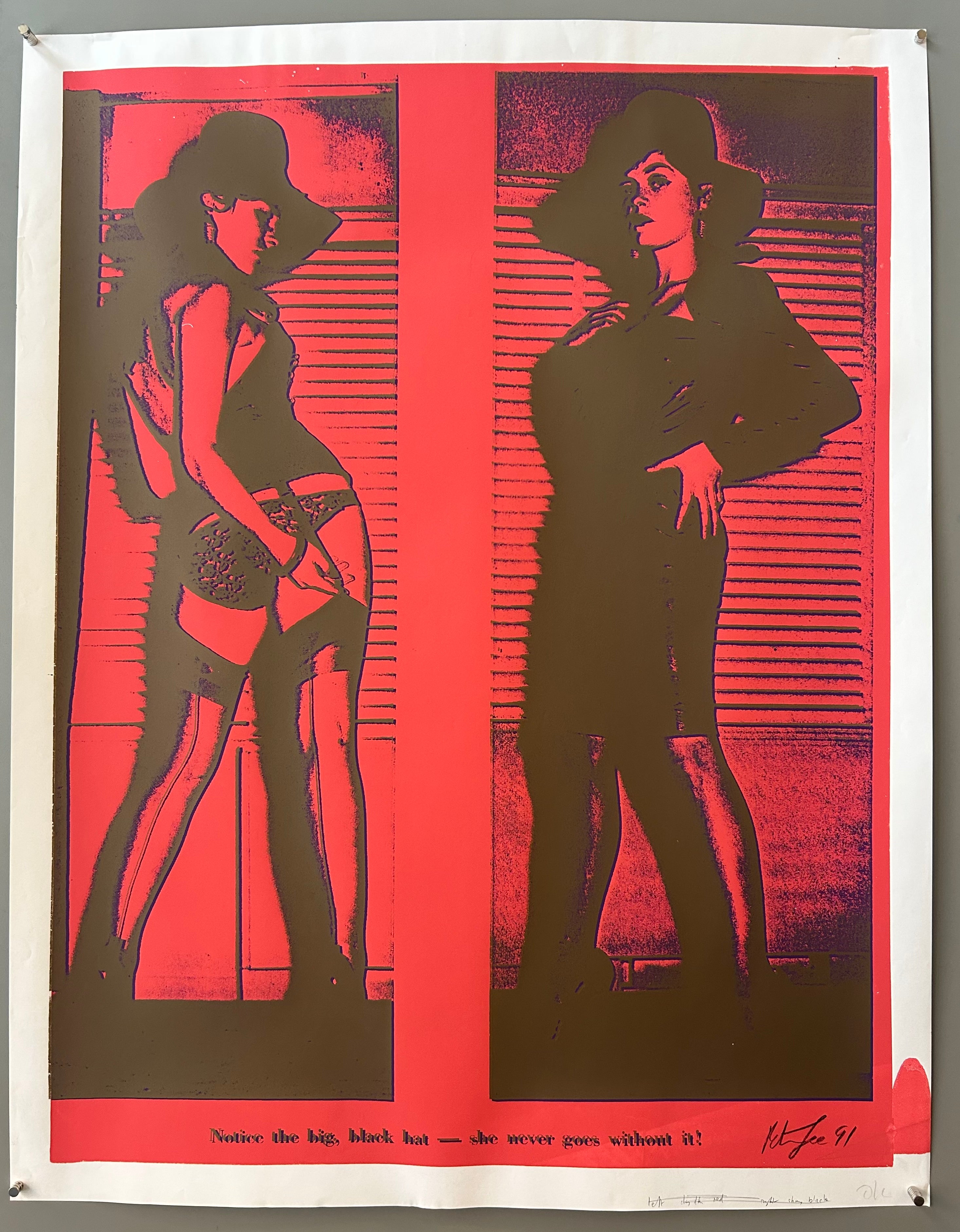 Original silkscreen print by artist Peter Gee. Two images laid side by side creates a bold and vivacious scene. The text at the bottom reads, "Notice the big, black hat -- she never goes without it!" Who is "she"? The mystery and vagueness makes this work all the more appealing! Gee often drew inspiration from fashion magazines and advertisements.