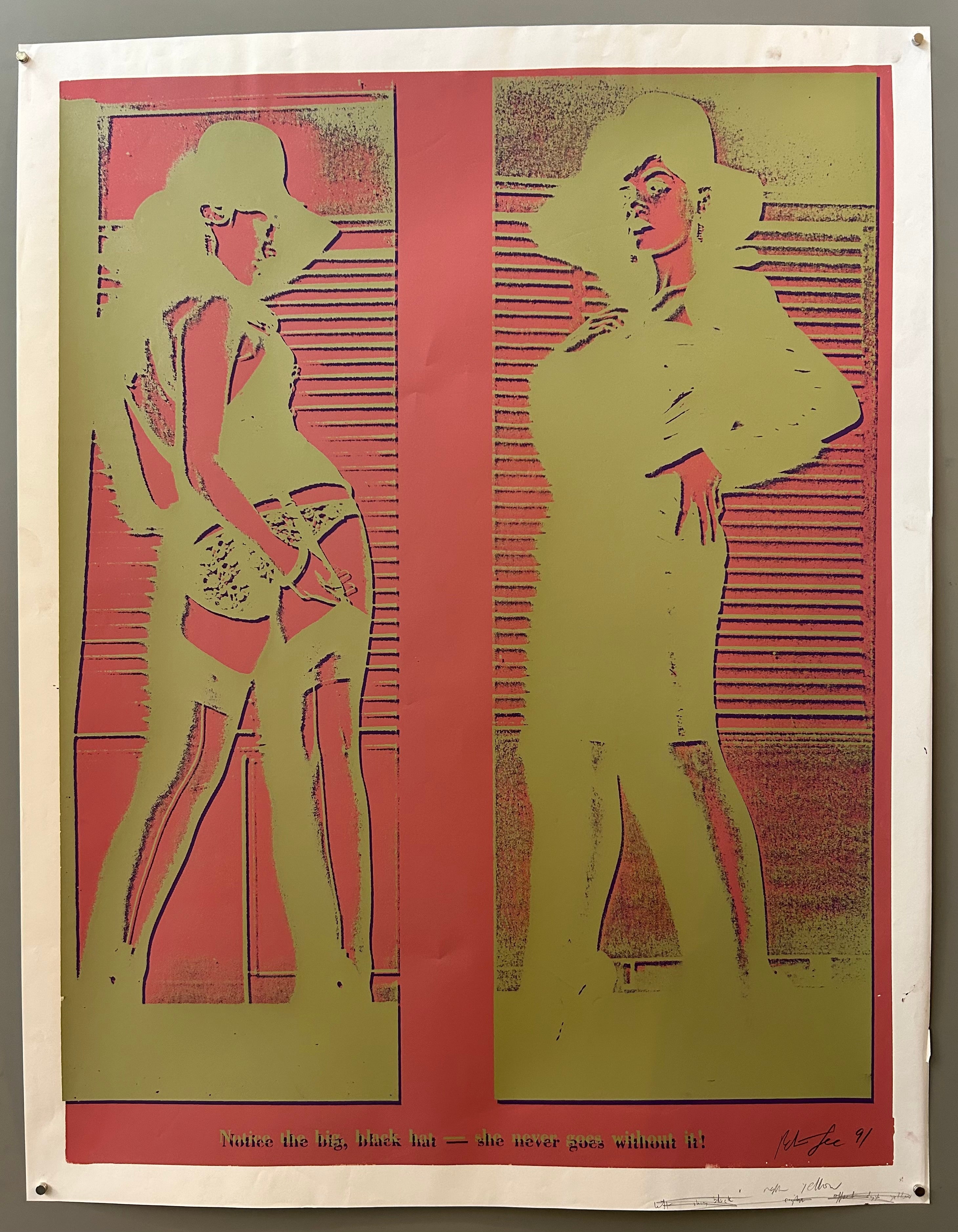 Original silkscreen print by artist Peter Gee. Two images laid side by side creates a bold and vivacious scene. The text at the bottom reads, "Notice the big, black hat -- she never goes without it!" Who is "she"? The mystery and vagueness makes this work all the more appealing! Gee often drew inspiration from fashion magazines and advertisements.