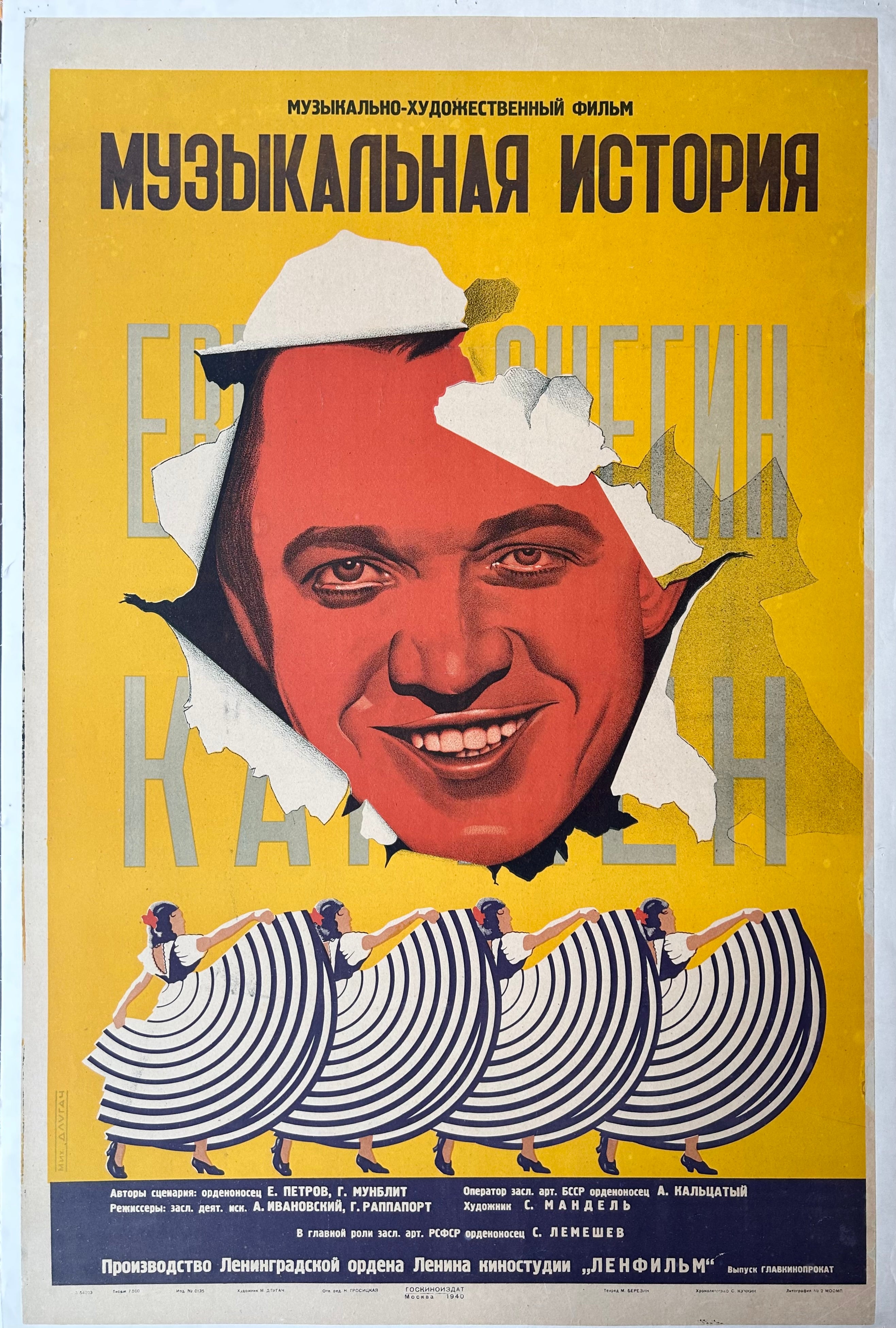 Vintage film poster for the Russian musical comedy film "Musical History." In pre-war Leningrad, a theater troupe is putting on a production of the opera Eugene Onegin—drama ensues.