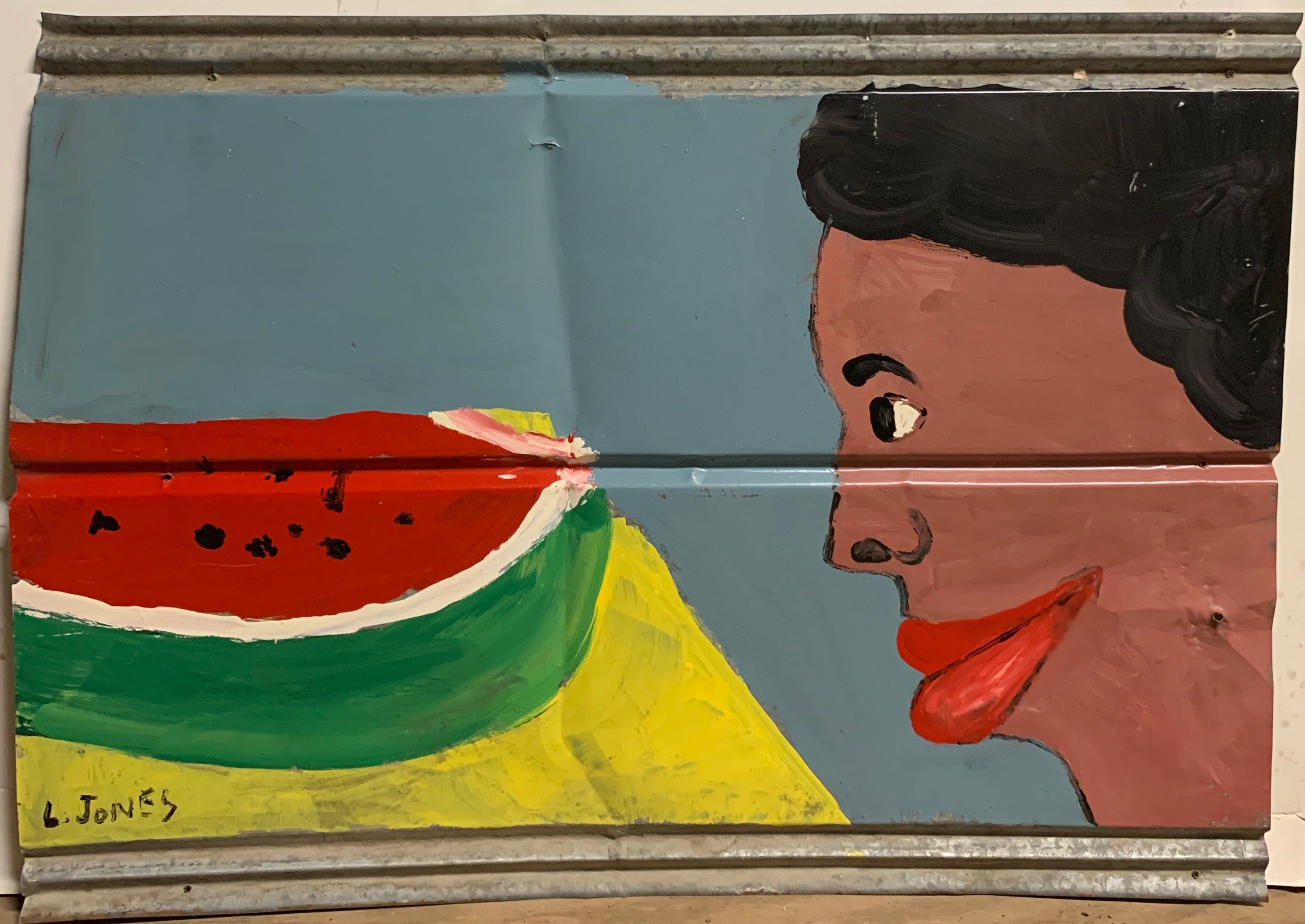 A native Georgian, Leonard Jones taught himself to paint when he was in high school. His works are greatly inspired by scenes from his childhood, images of rural living in the South including housewives, church-goers, and laborers. A folk artist who is often considered an outsider, Jones paints to capture candid daily life and the beauty found in the community around him.The use of scrap wood or tin roofing alludes to the buildings he grew up with, and he often incorporates these materials into the paintings themselves. The materials are covered in bold backgrounds of color, which Jones paints subjects over using his fingers or the handles of brushes, leaving a distinctly Leonard Jones work of art.