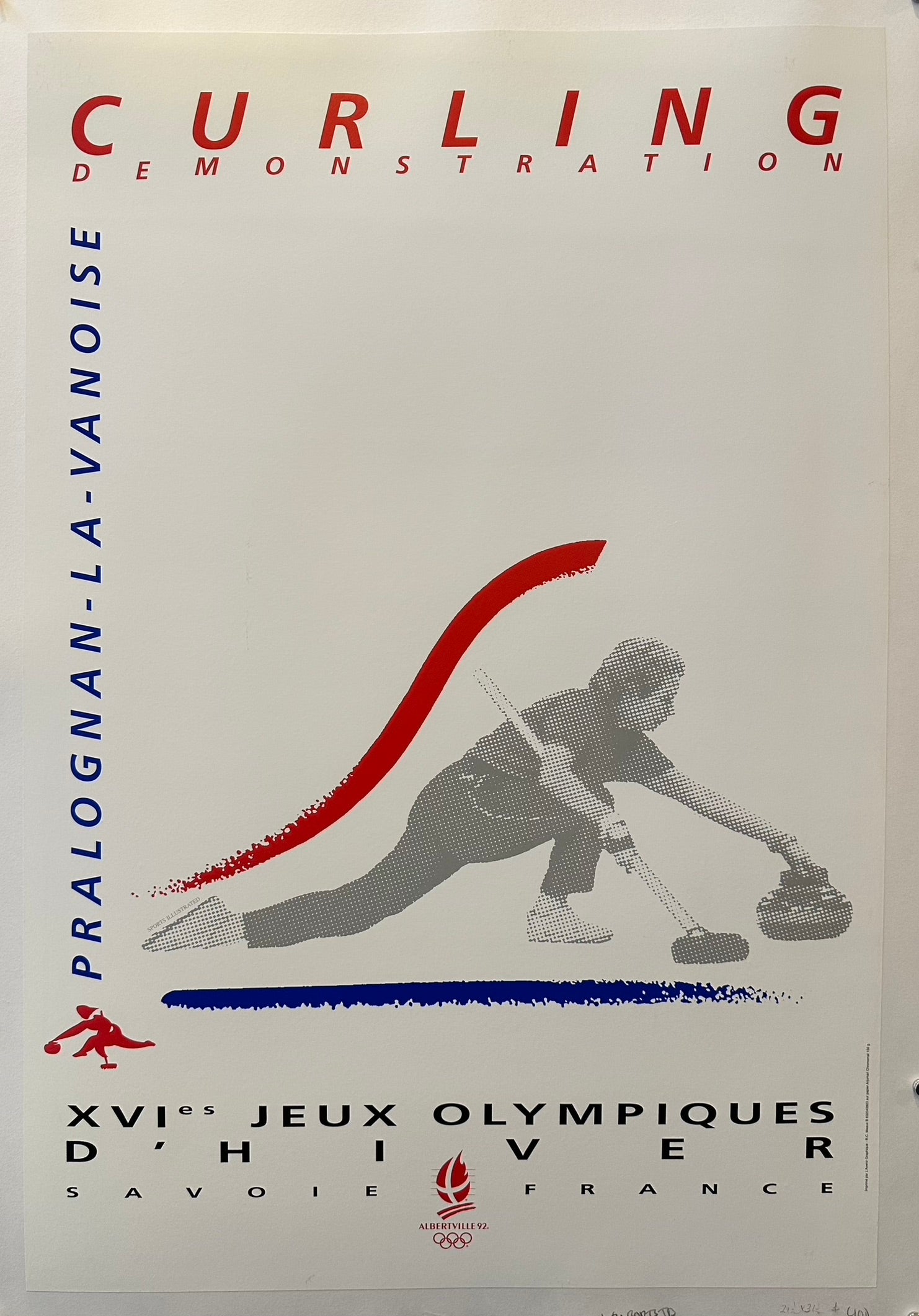 This amazing print advertises the Winter Olympics held in Albertville, Savoie, France in 1992. An Olympic curler prepares for their move.