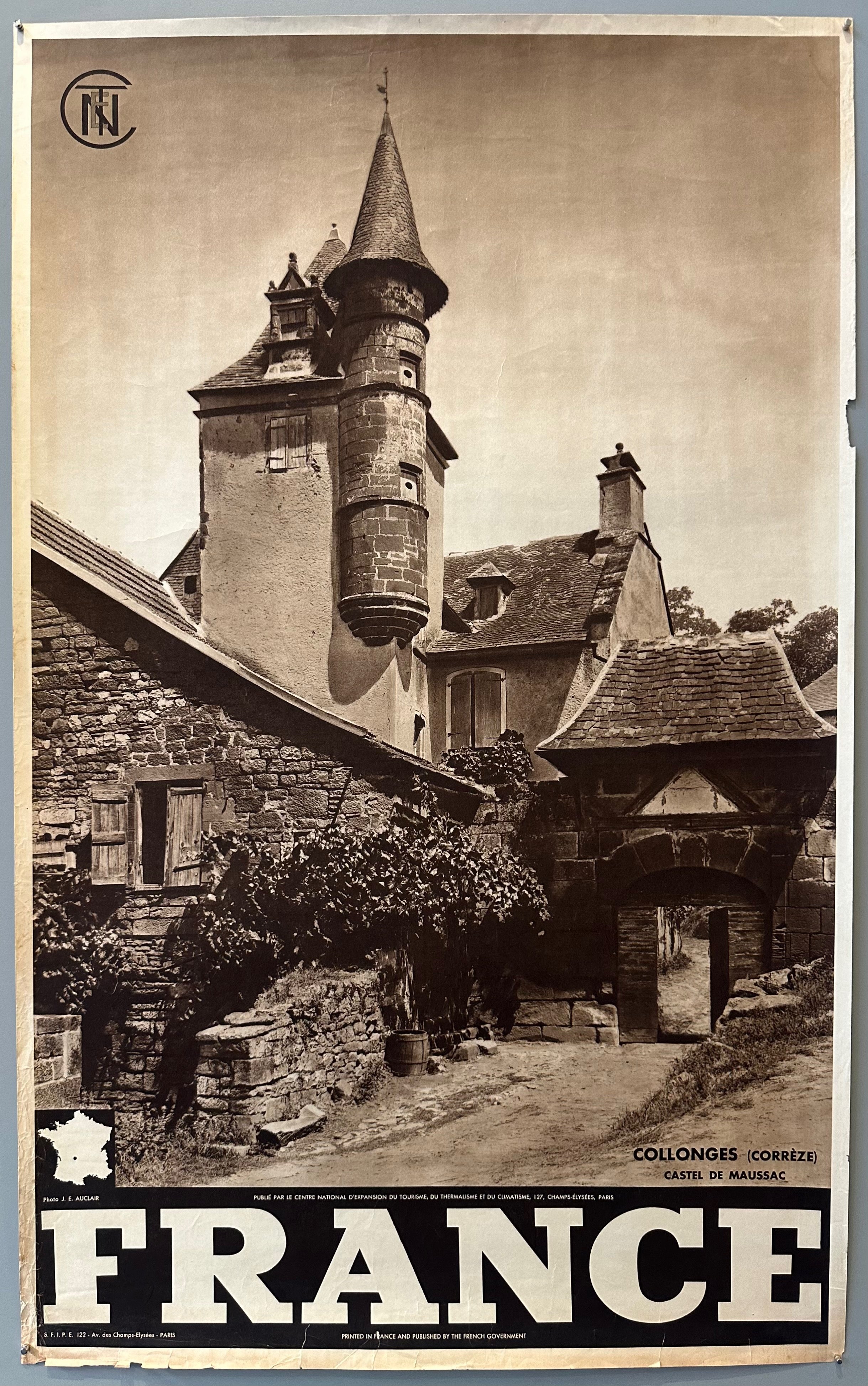 This black and white poster promotes the Castel de Maussac, a beautiful example of historic architecture in Collonges-la-Rouge, a fascinating commune in Corrèze that has existed since at least the 8th century. Notably, it was constructed entirely with red sandstone. Poster features a photograph of the castle and a small map of France in the bottom left with its location marked.
