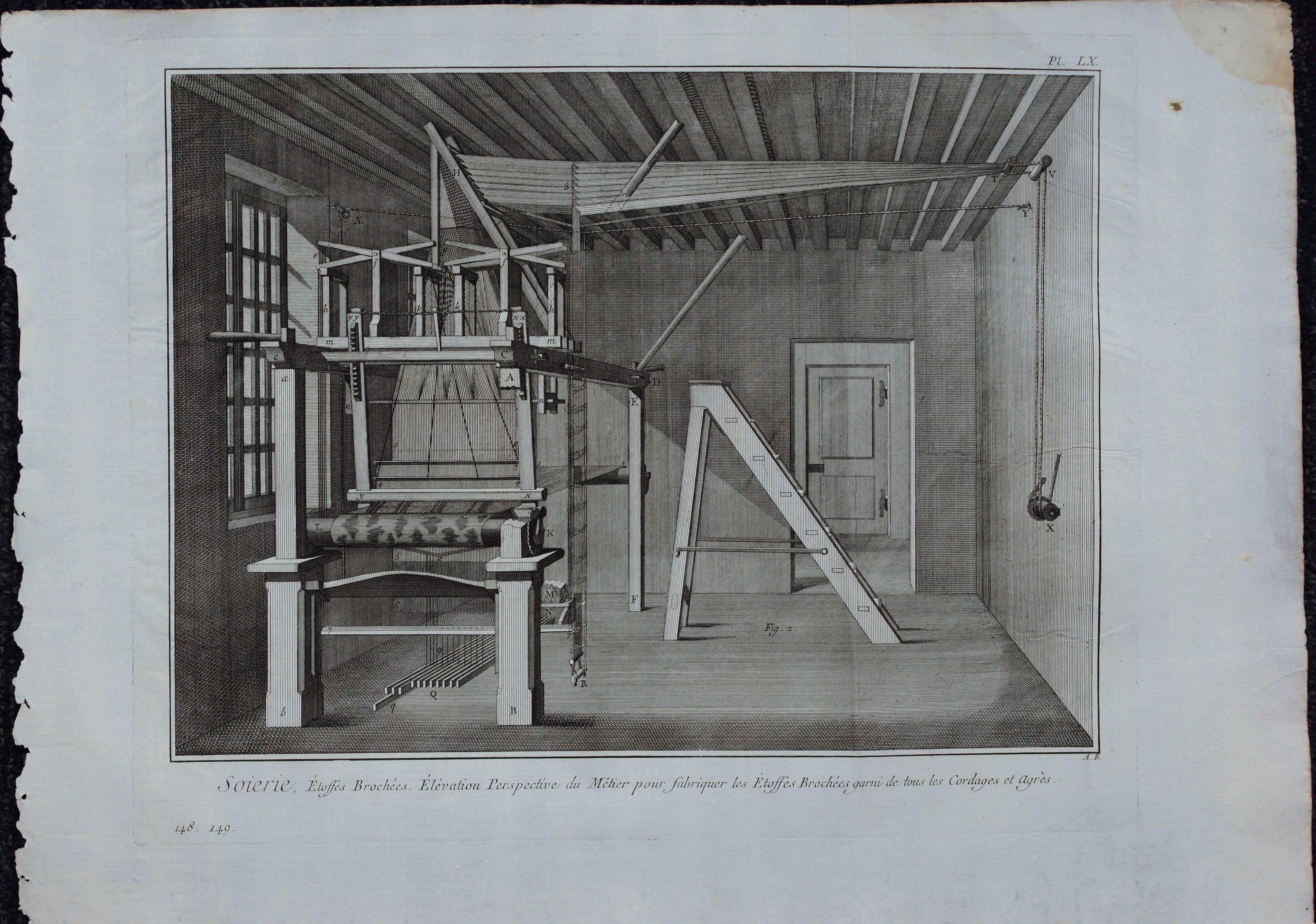 Description: "Soierie, Etoffes Brochees. Elevation Perspective du Metier pour fabriquer les Etoffes Brochees garni de tous les Cordages et Agres"