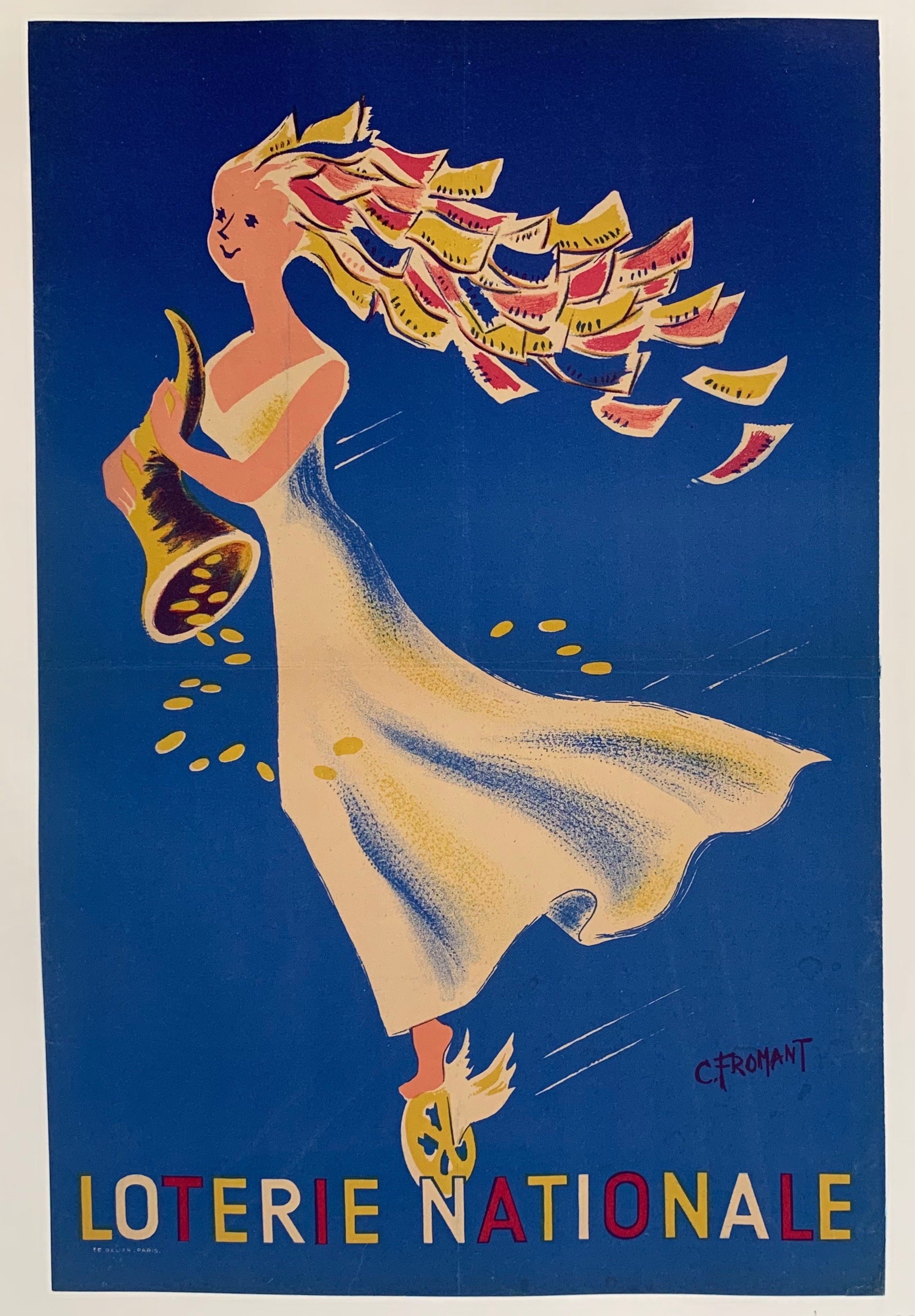 A goddess holding a horn of spilling coins and with hair made of money floats by.