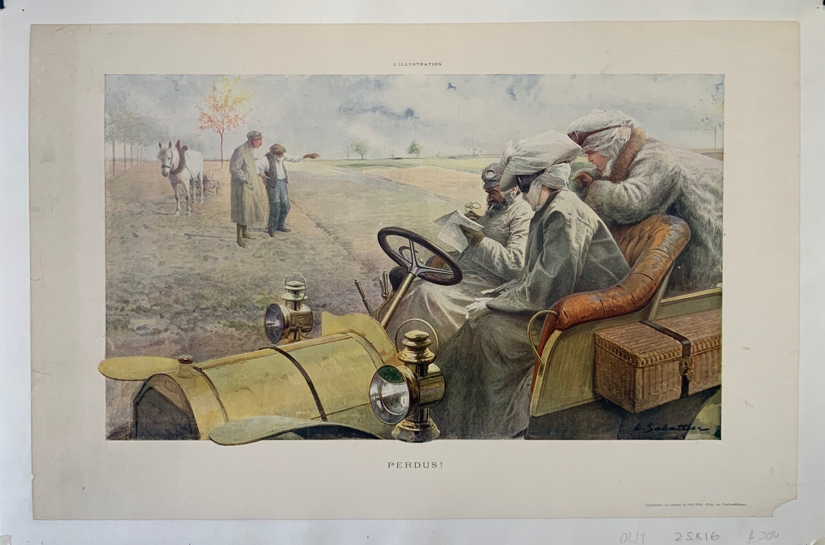 A vintage French print of a group of travelers driving in the countryside. Hopelessly lost, they stop the car and all huddle around the road map.\