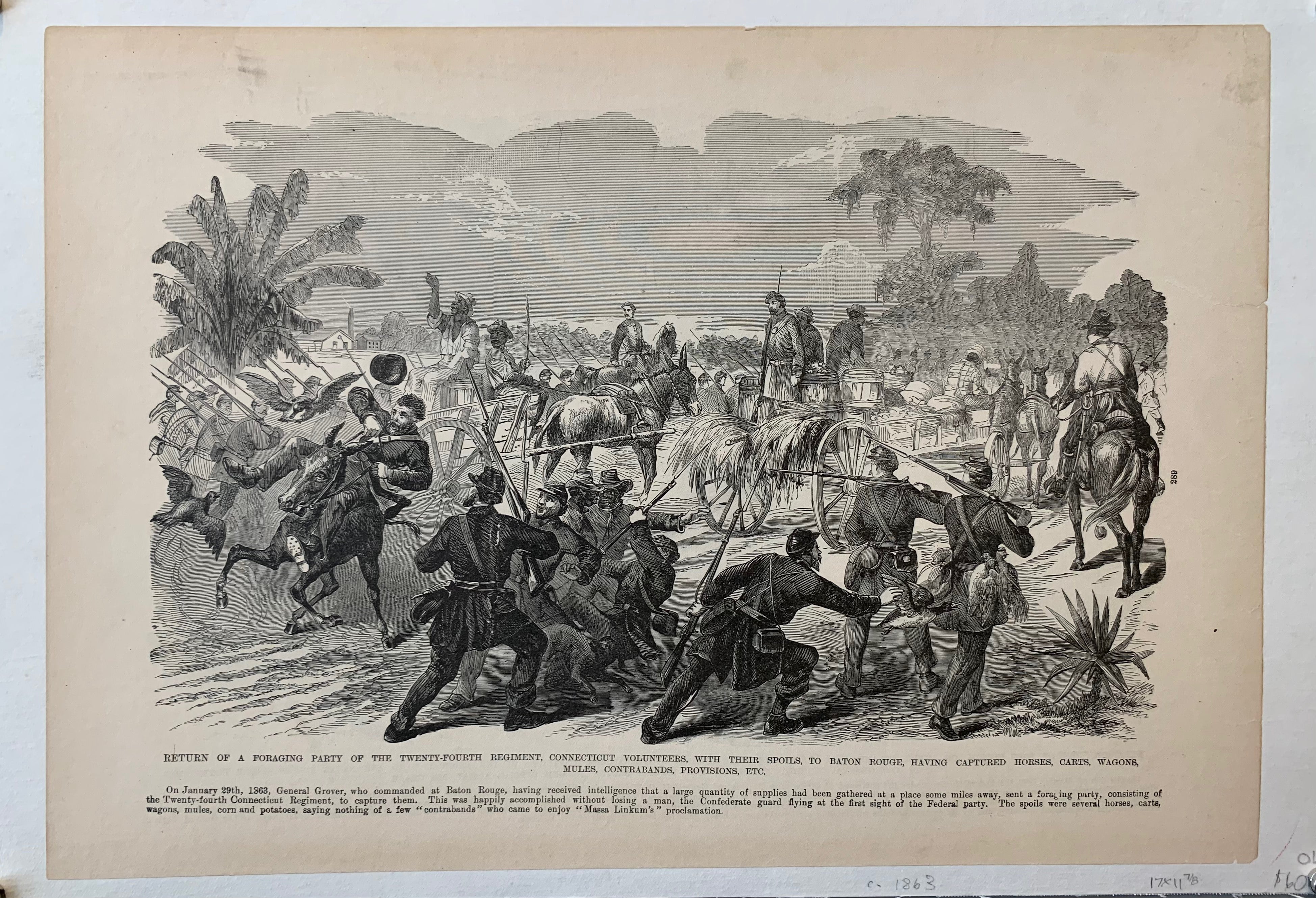 "Return of a foraging party of the twenty-fourth regiment, Connecticut volunteers, with their spoils, to Bagon Rouge, having captured horses, cars, wagons, mules, contrabands, provisions, etc."