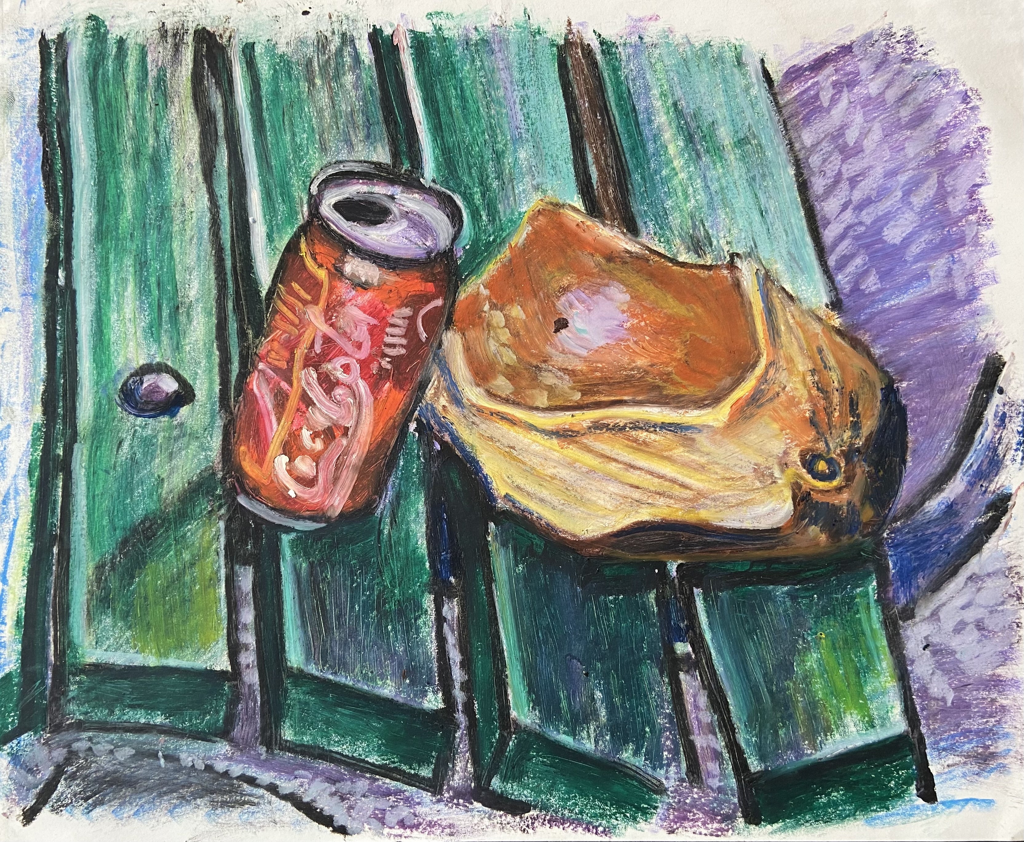 1991 artwork by Bokov depicting a can and paper bag on a bench.