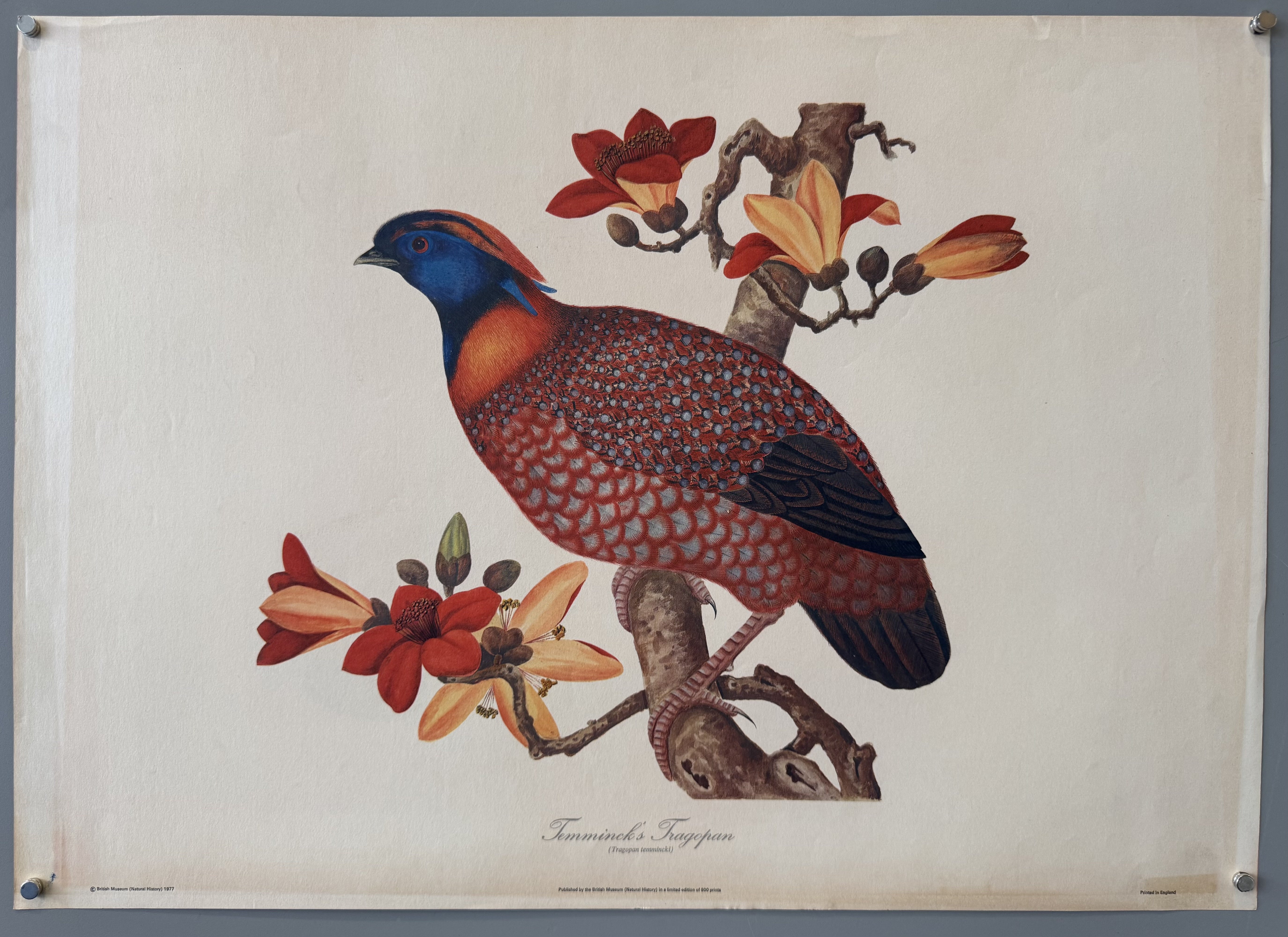A male Temminck's tragopan pheasant perched on a flowering branch.