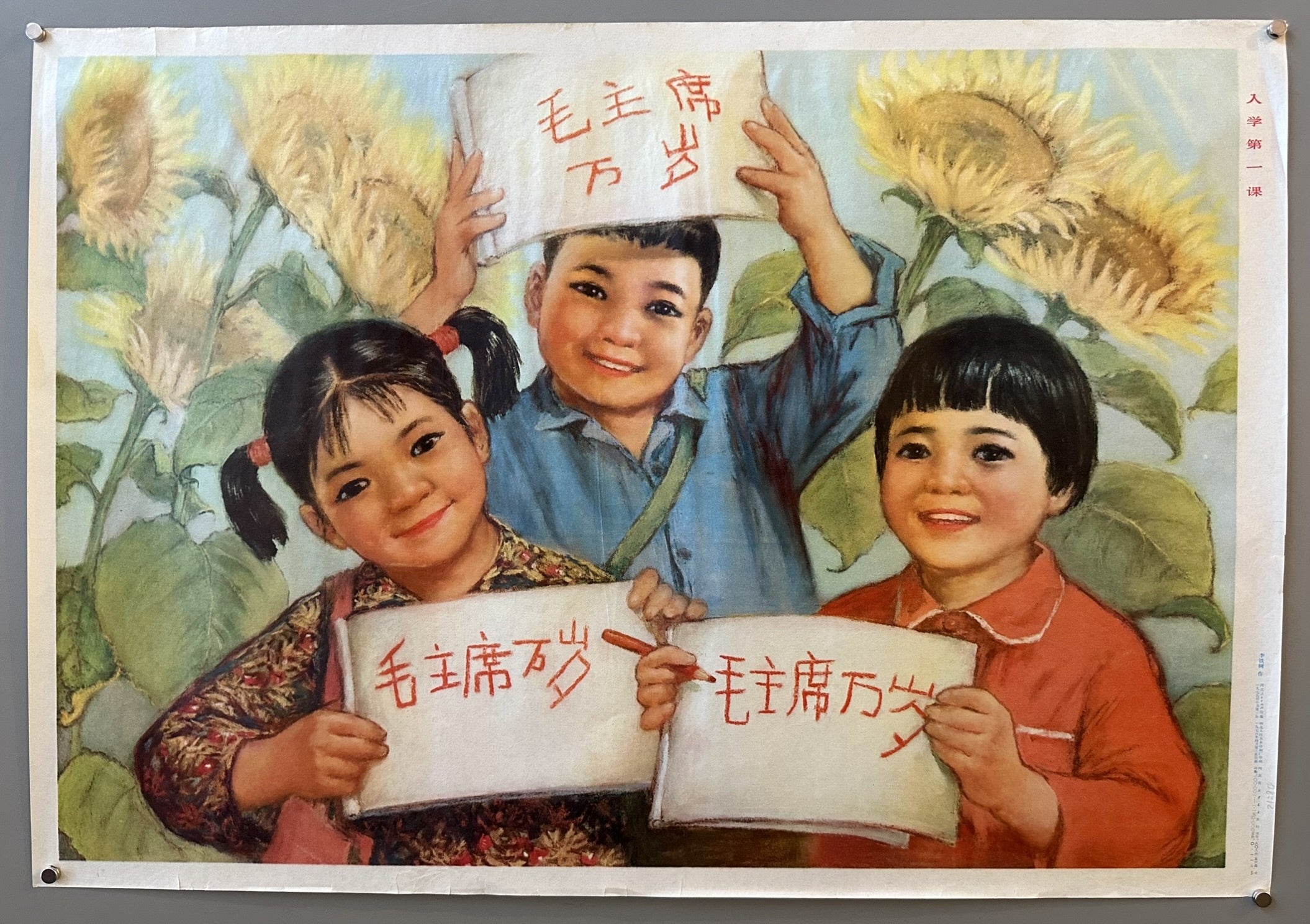 Three very young children proudly holding up notebooks in which they have each learned to write "Chairman Mao" in red crayon: "First lesson." Flowers bloom behind them.