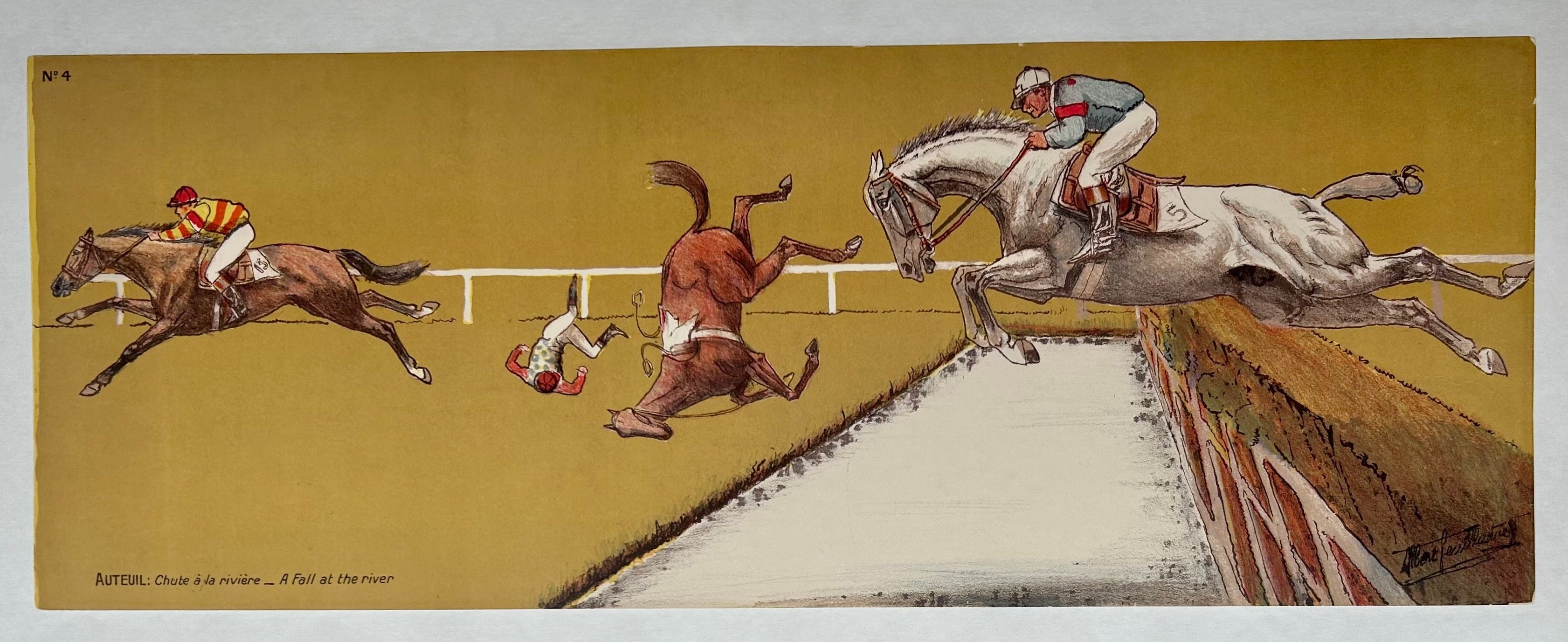Image: This poster features a horse and its rider falling after jumping over a river in a race. Two other horses and riders continue on.