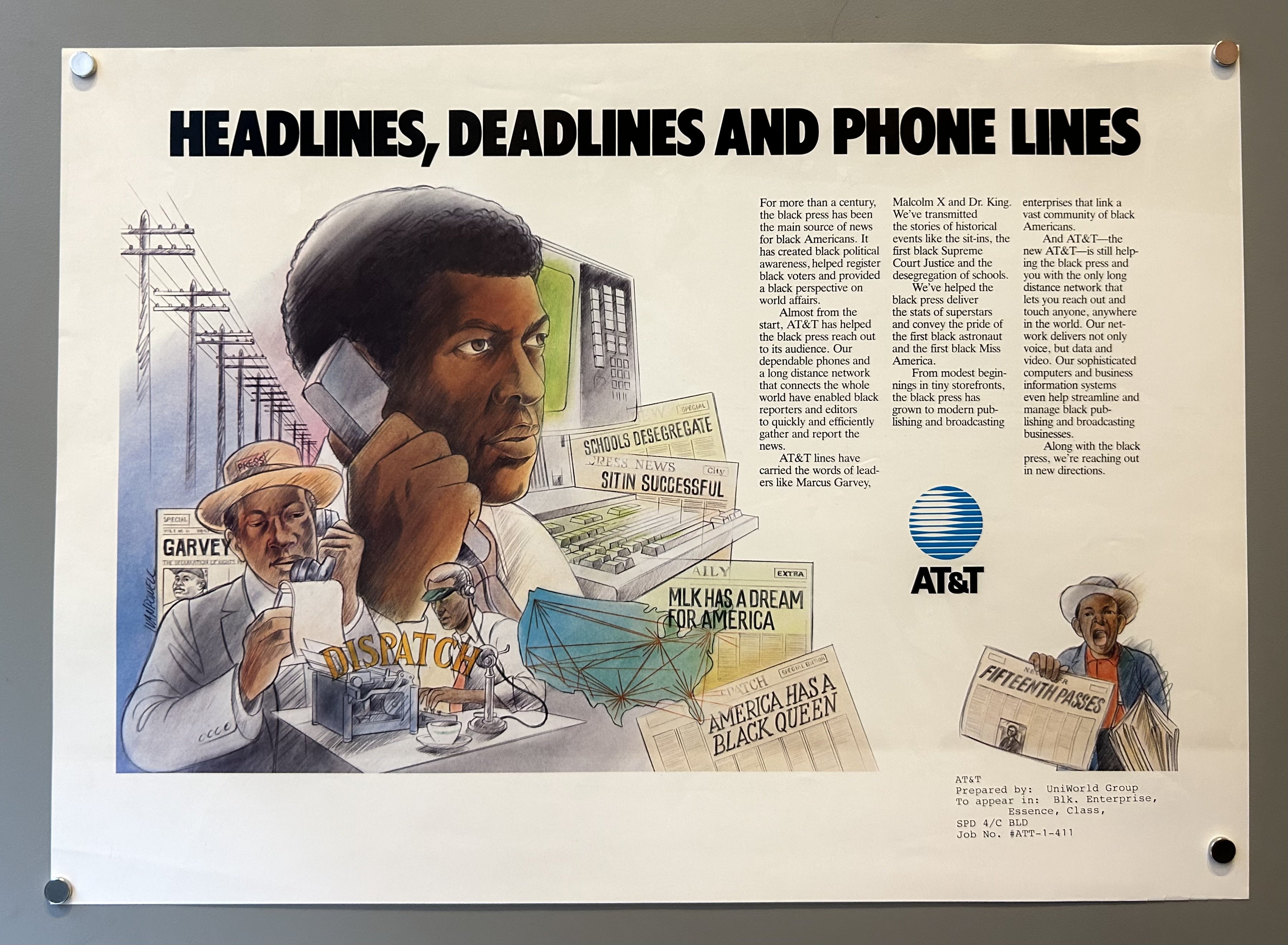 Advertisement for AT&T utilizing the fame of Black leaders Marcus Garvey, Malcolm X, and Dr. Martin Luther King Jr.