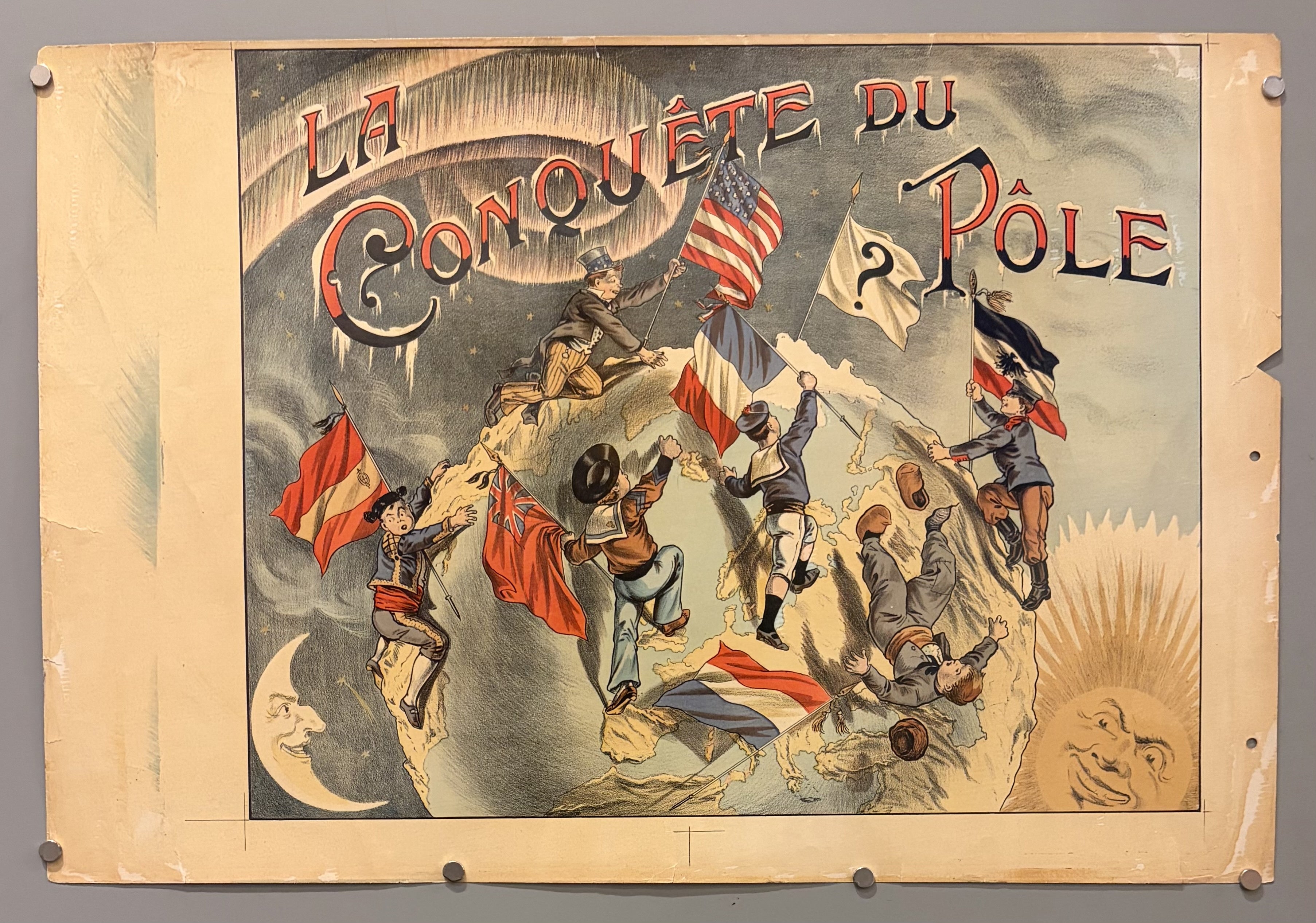 Original turn-of-century print. The illustration shows representatives from different countries, including Spain, the United States, England, Holland, France, and Germany, fighting to plant their flag first on the North Pole, "The Conquest of the Pole."