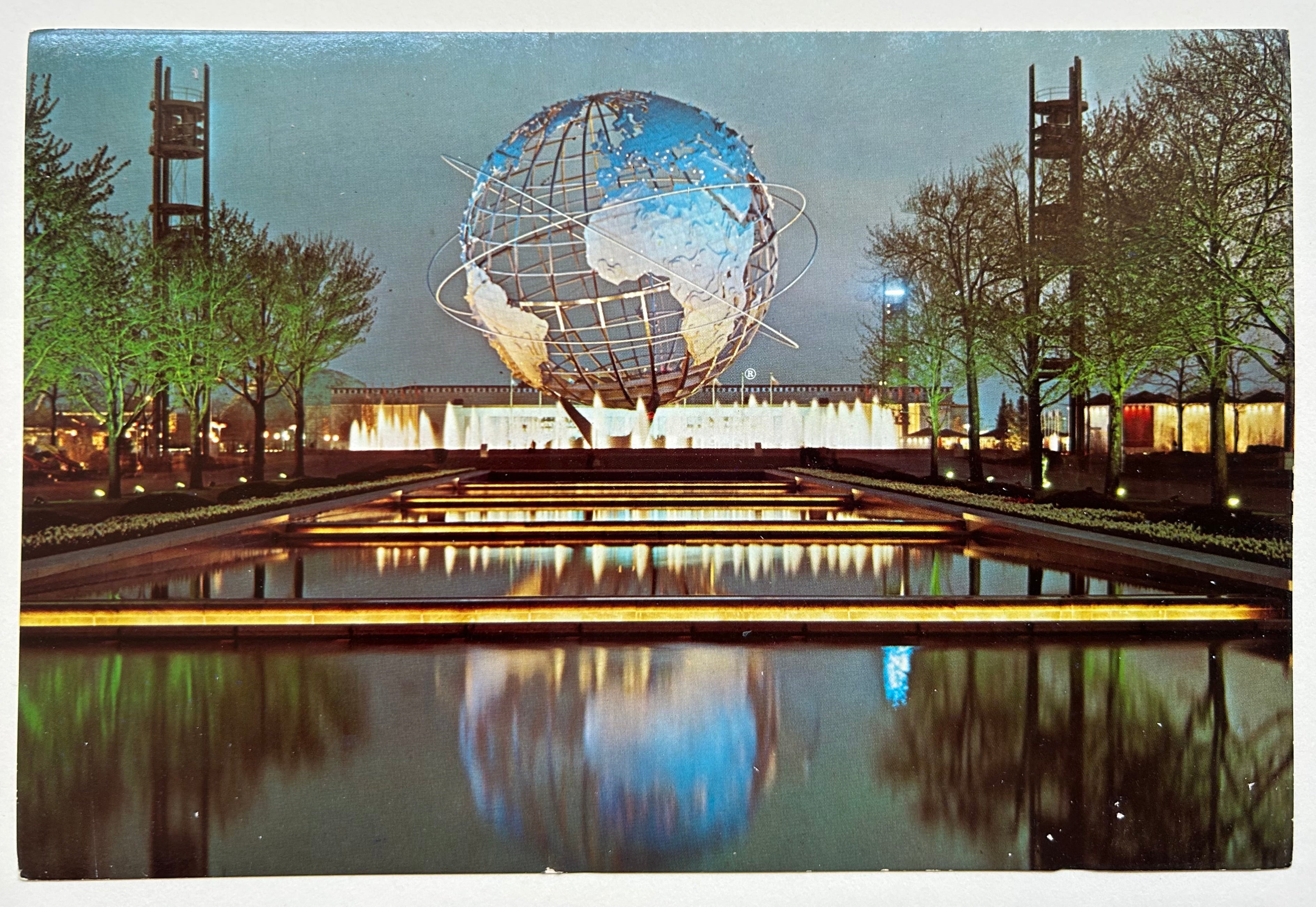 Oversized postcard from New York's World Fair showcases a photograph of the "Unisphere," the symbol of the world fair.