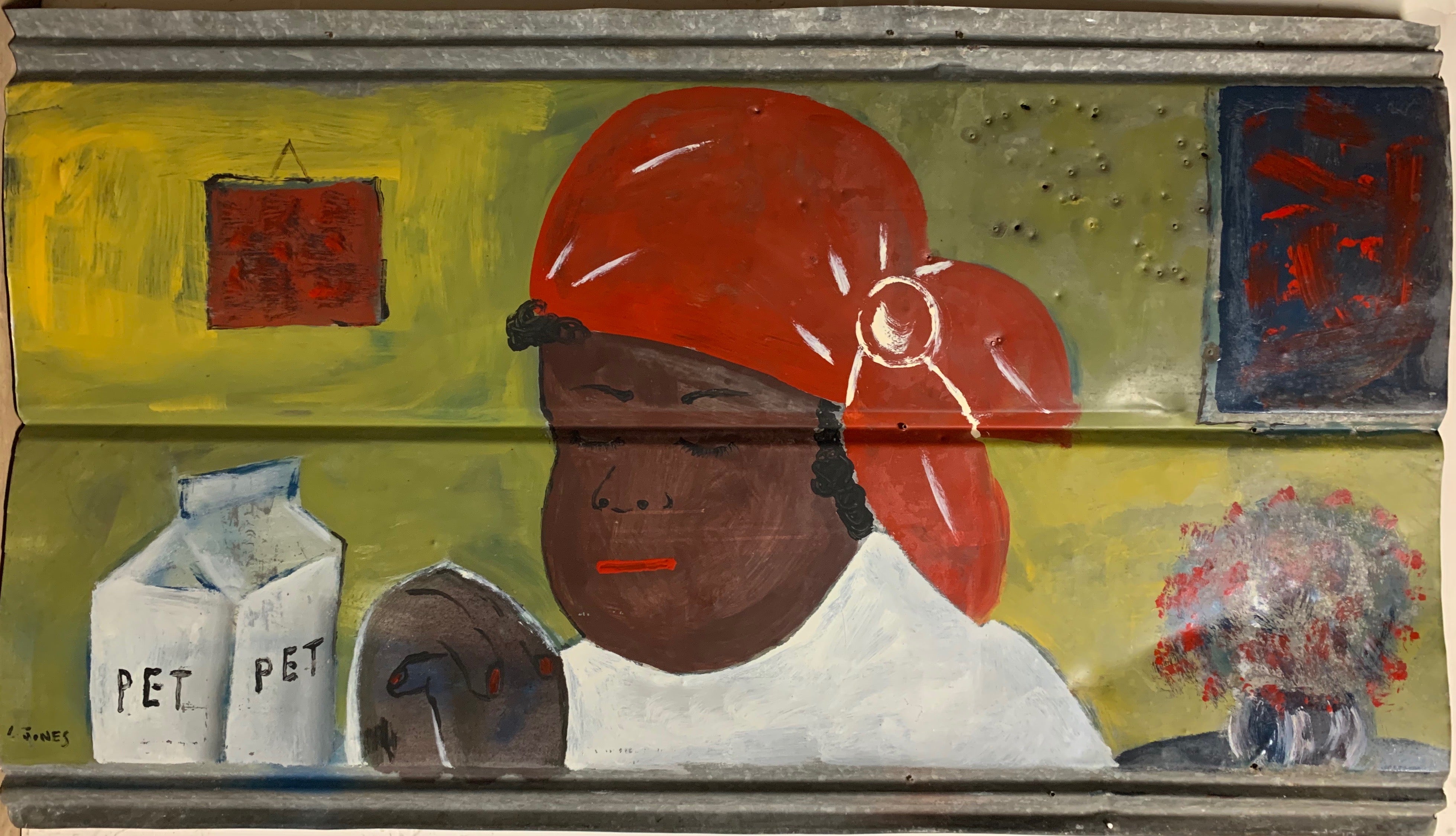 A native Georgian, Leonard Jones taught himself to paint when he was in high school. His works are greatly inspired by scenes from his childhood, images of rural living in the South including housewives, church-goers, and laborers. A folk artist who is often considered an outsider, Jones paints to capture candid daily life and the beauty found in the community around him.The use of scrap wood or tin roofing alludes to the buildings he grew up with, and he often incorporates these materials into the paintings themselves. The materials are covered in bold backgrounds of color, which Jones paints subjects over using his fingers or the handles of brushes, leaving a distinctly Leonard Jones work of art.