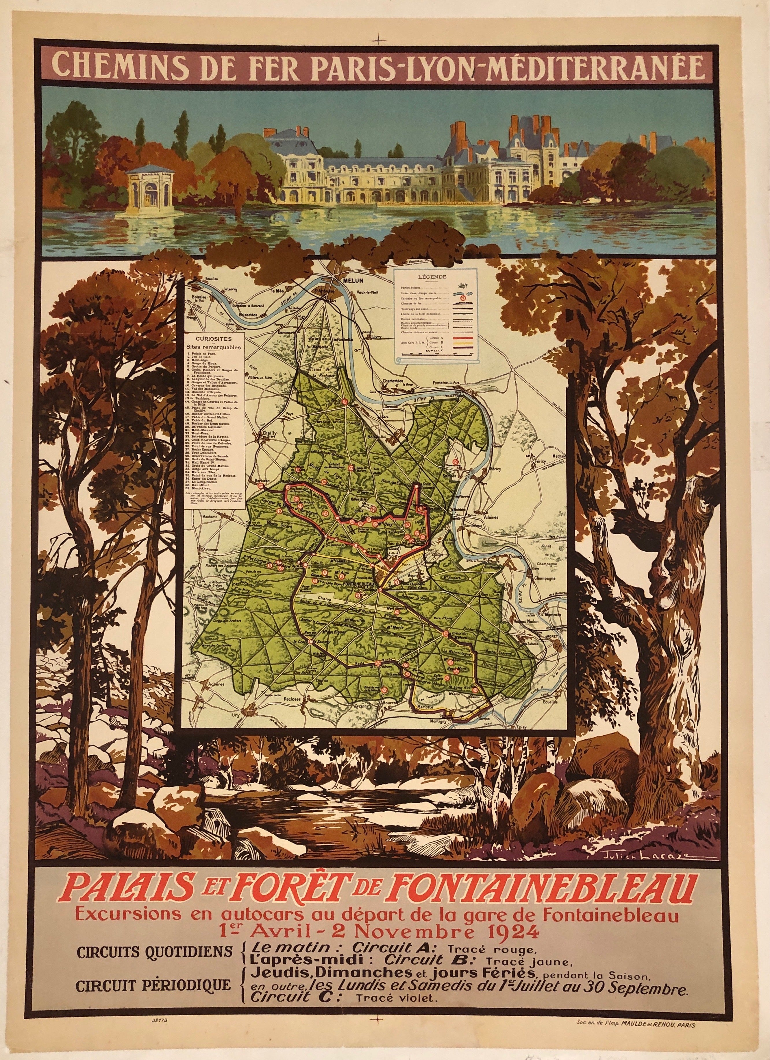 "Chemins de fer Paris-Lyon-Mediterranee. Excursions en autocars au depart de la gare de Fountainebleu 1er Avril-2 Novembre 1924." (Paris-Lyon-Mediterranean railway. Coach trips departing from Fontainebleu station.)