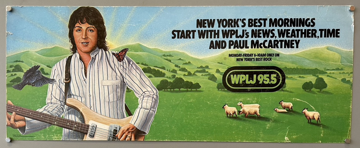 Vintage subway poster for WPLJ's morning show, which featured "New York's Best Mornings" with "News, Weather, Time AND Paul McCartney" from Monday to Friday, 6-10 AM.