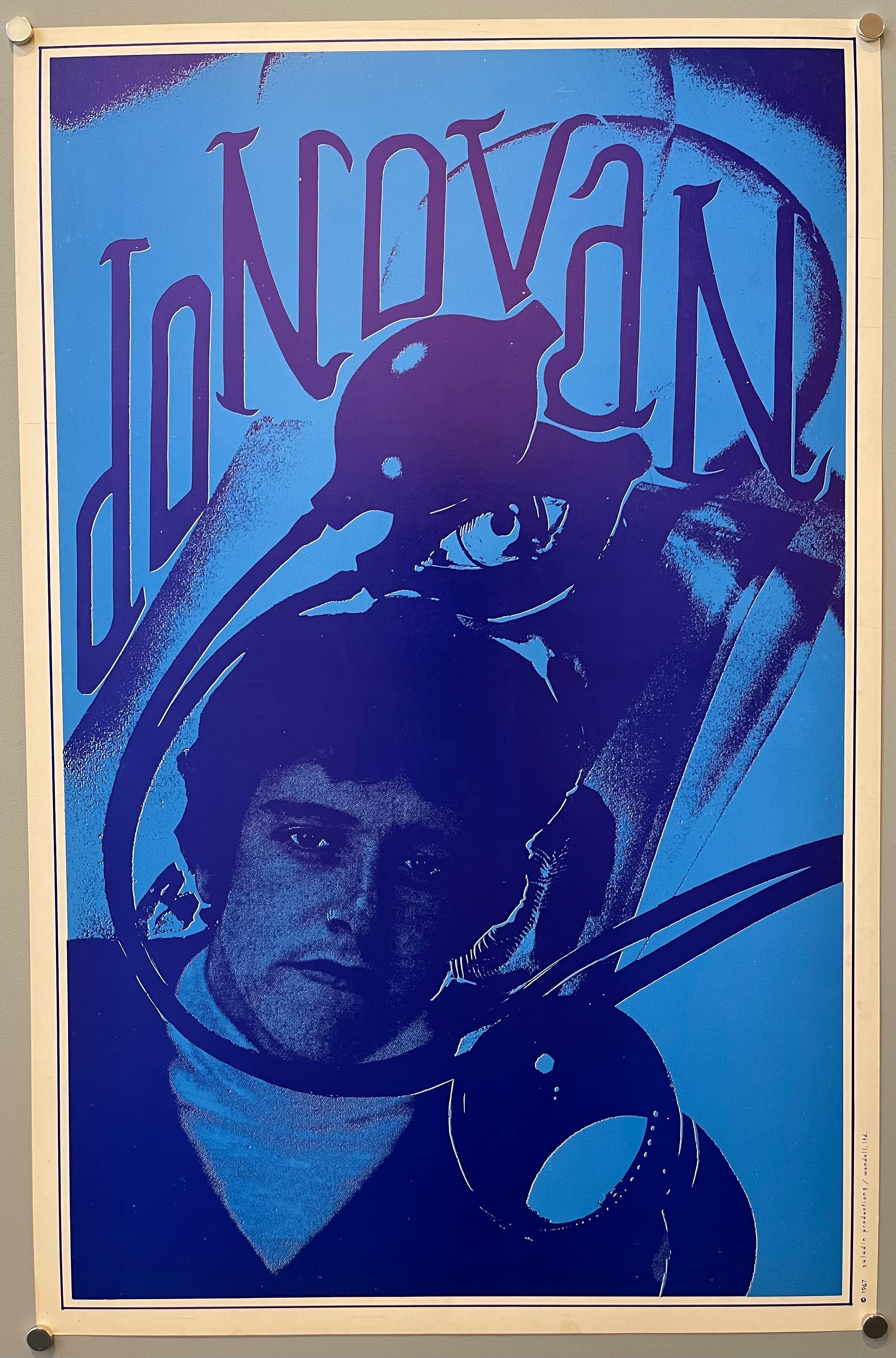 This poster by Saladin Head Shop depicts Donovan Leitch, a Scottish folk/psychedelic rock singer, made famous by his hit single 'Mellow Yellow' in 1967.