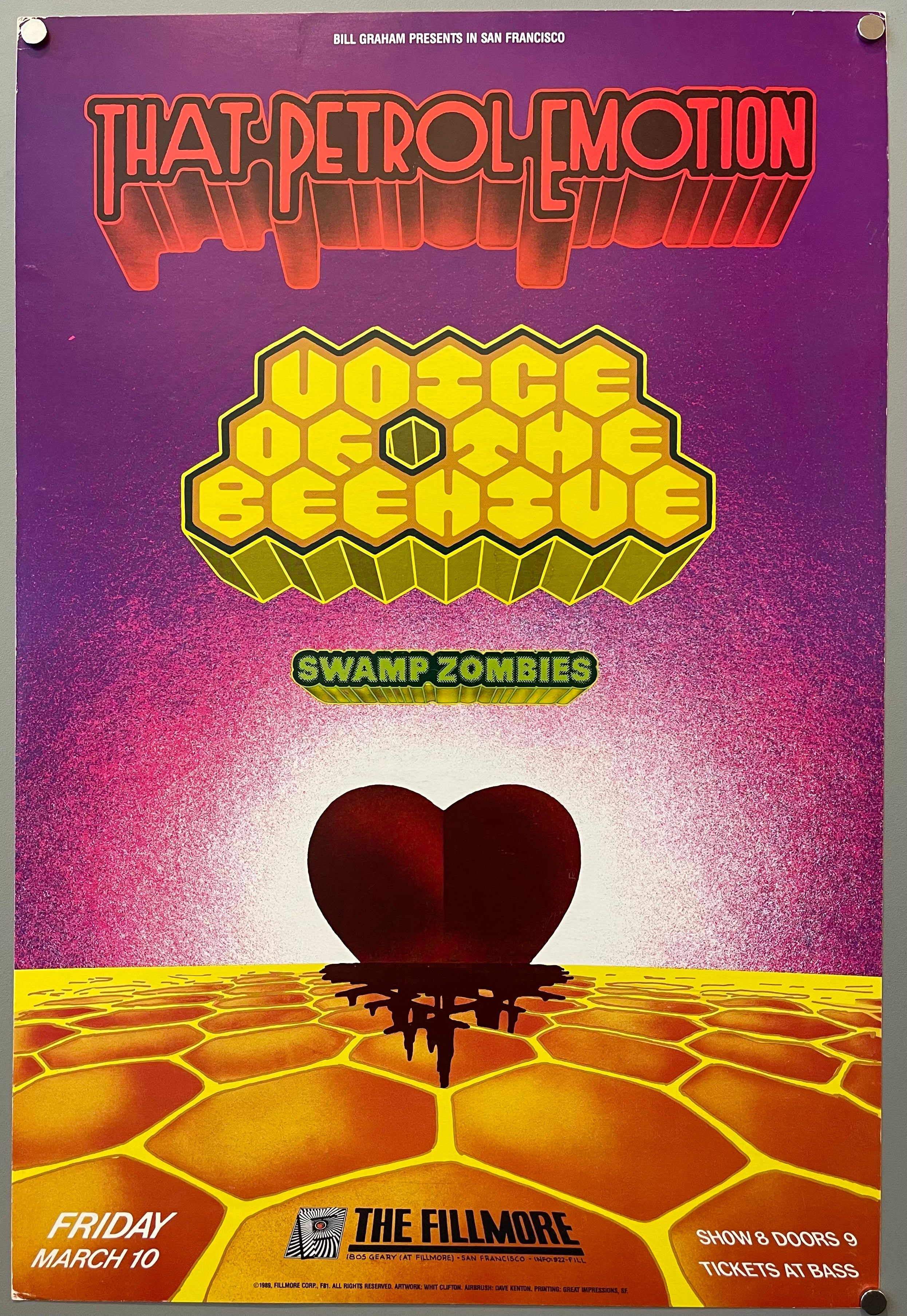 This poster advertises headlining act That Petrol Emotion playing at the FIllmore Auditorium with secondary acts Voice of the Beehive and Swamp Zombies on March 10, 1989.