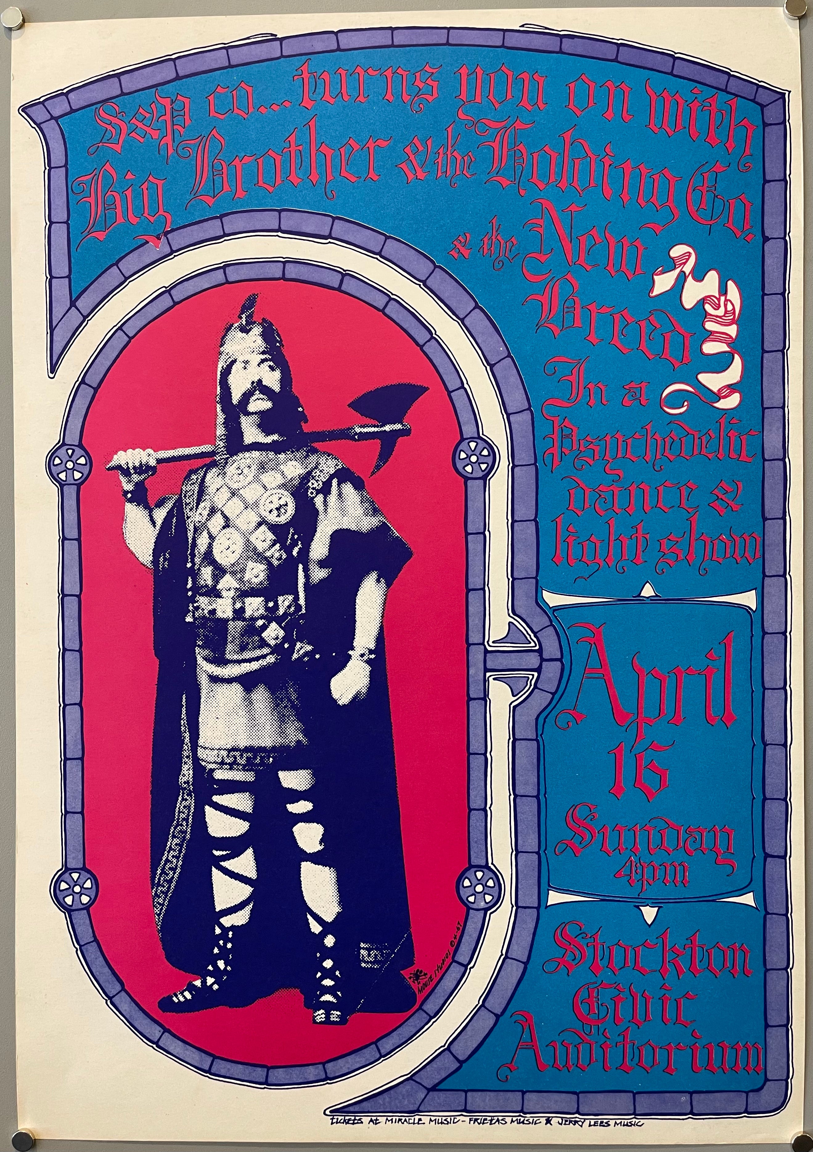 Stanley Mouse designed this medieval-looking poster for Big Brother & the Holding Co. and the New Breed when they performed at Stockton Civic Auditorium on April 16, 1967. As not many concerts were held in California's Central Valley, this poster is considered quite unique.