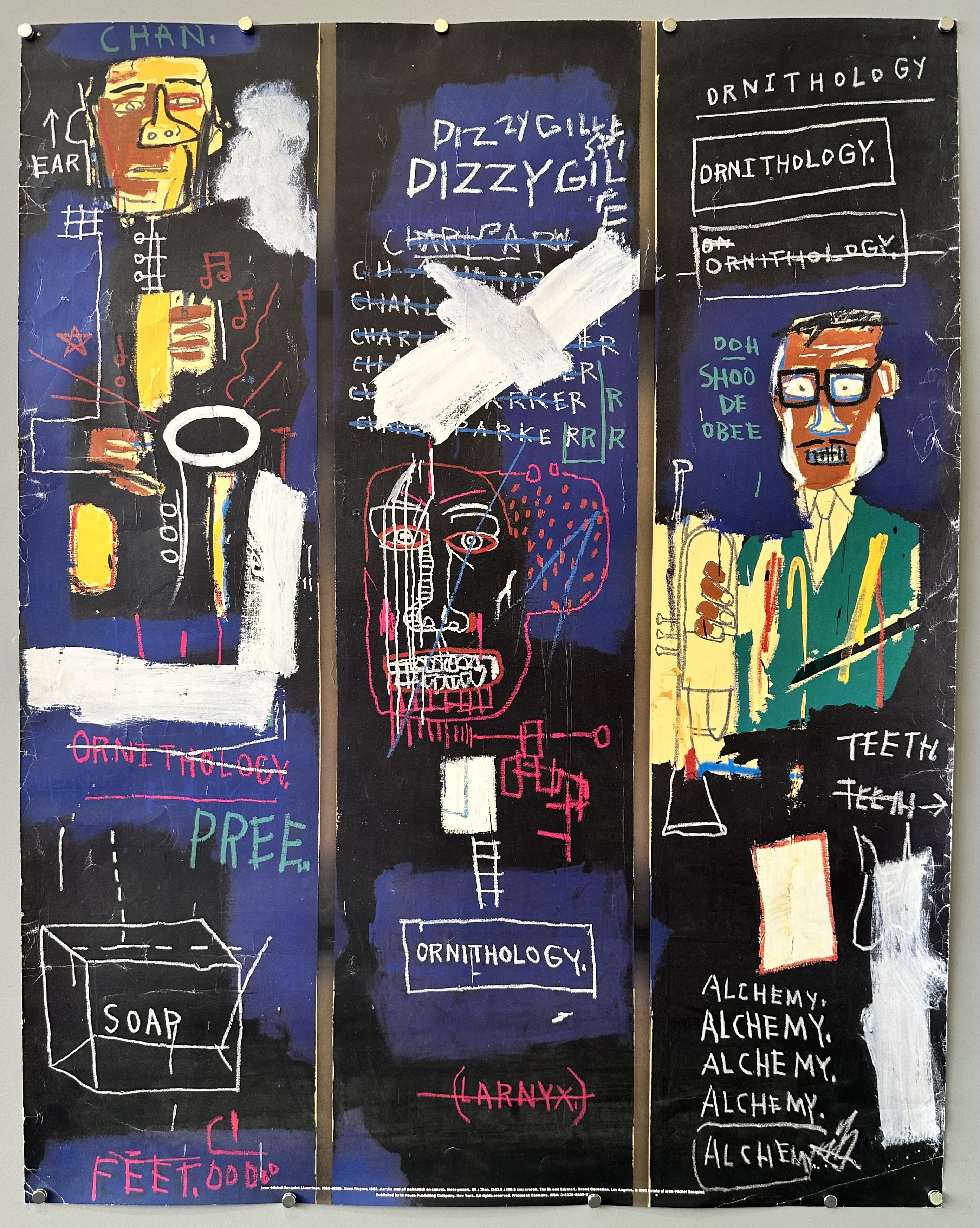 Horn Players is a 1983 triptych painting by Jean-Michel Basquiat that serves as an energetic tribute to jazz legends Charlie Parker and Dizzy Gillespie.