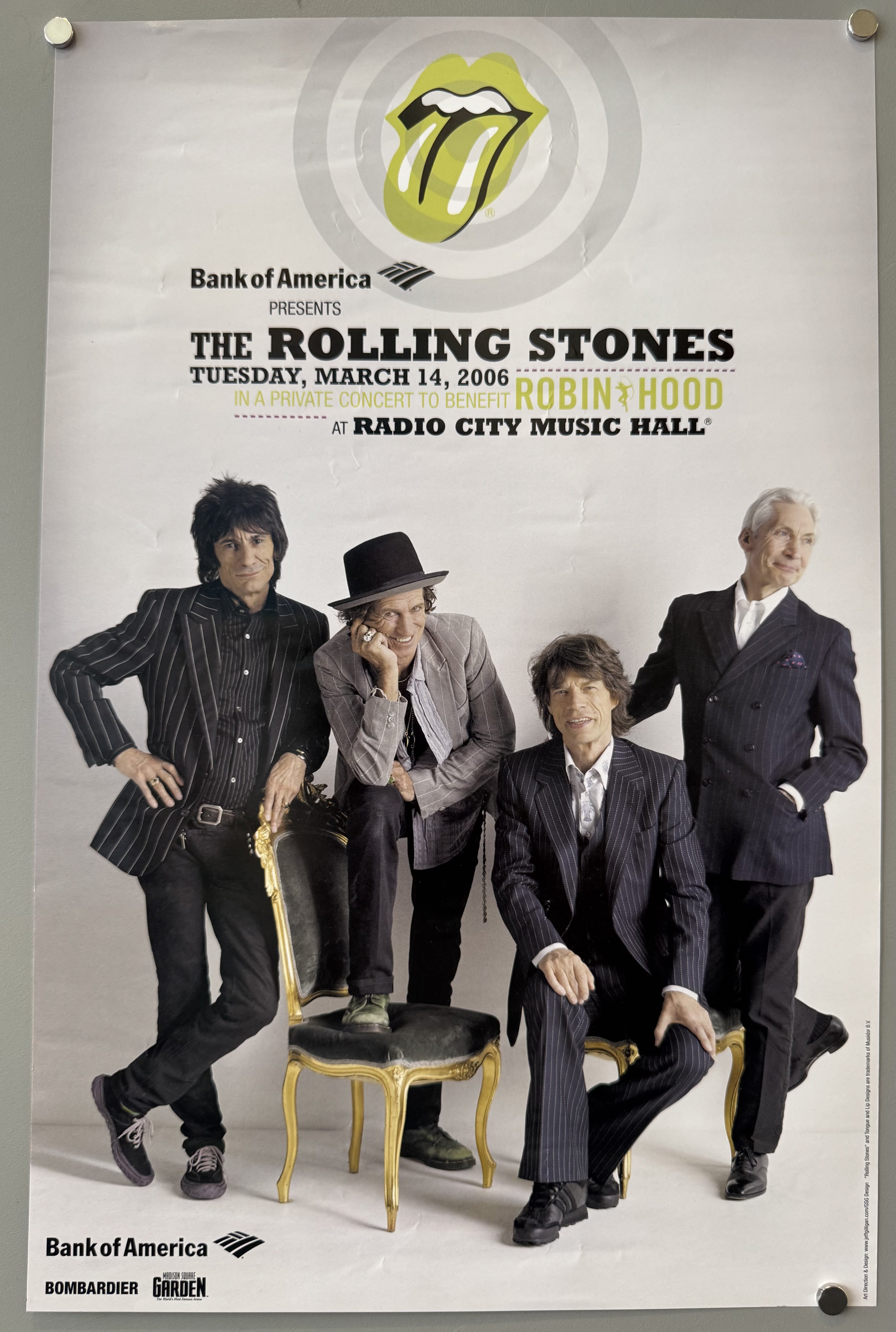 A rare, private benefit concert by The Rolling Stones was held at Radio City Music Hall in New York City. Bank of America presented the concert to benefit the charity organization Robin Hood.