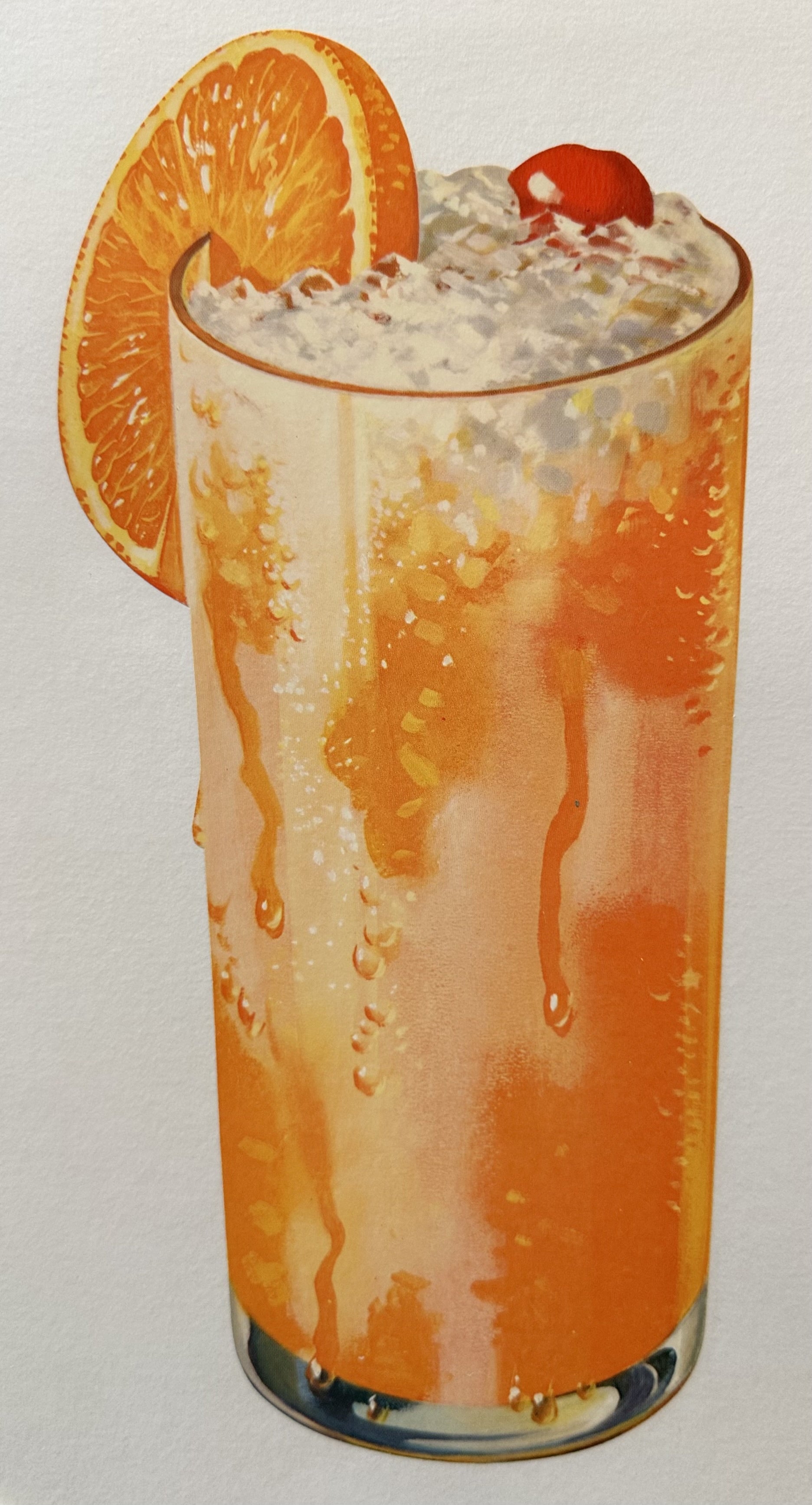A tall glass filled with a bright orange-colored beverage, topped with a generous amount of frost