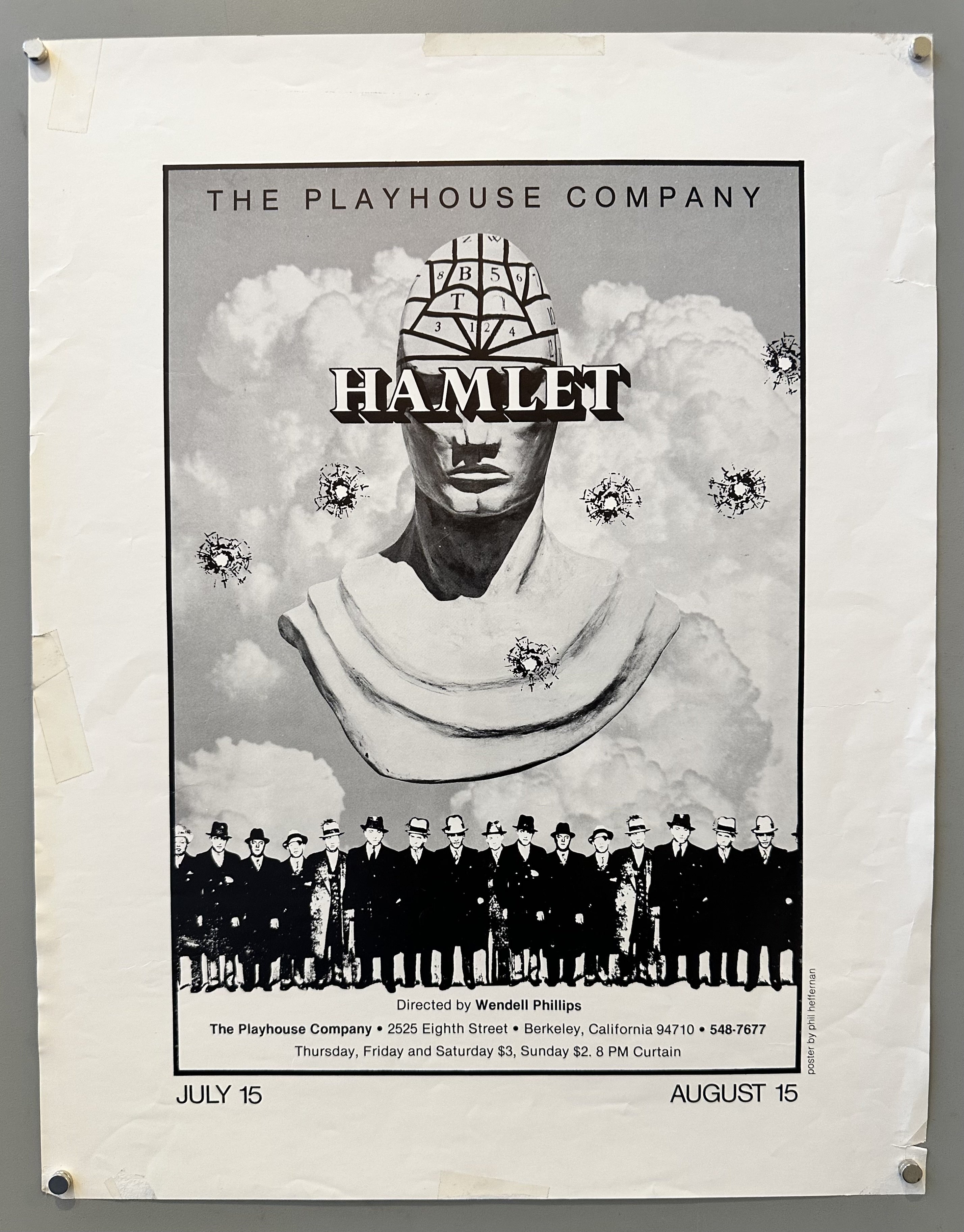 Poster promoting a theatrical run of Hamlet at the Playhouse Company in Berkeley.