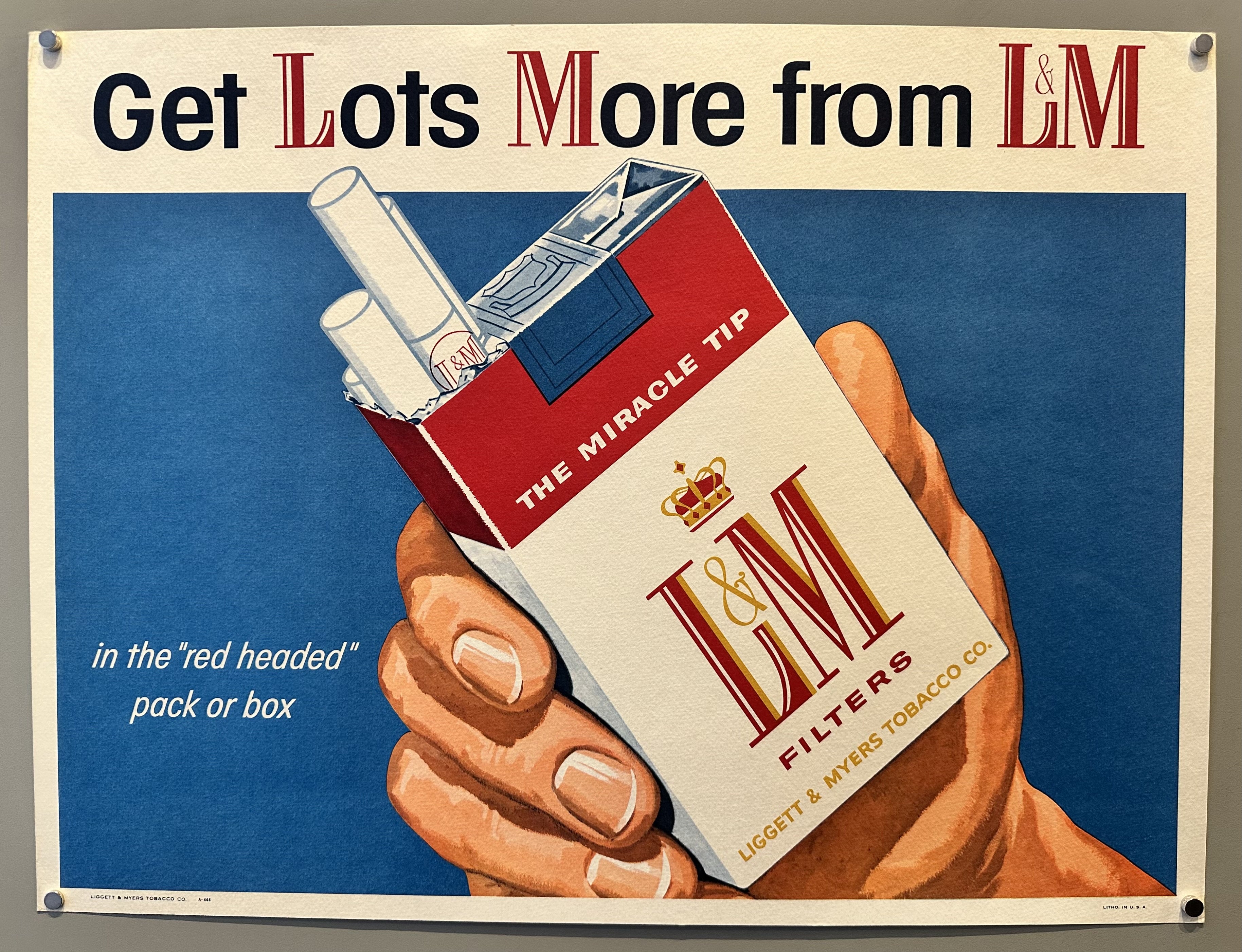 L&M Cigarette sign promoting The Miracle Tip: L&M introduced the "Miracle Tip" filter in 1953. This was part of a larger 1950s industry trend where cigarette filters were marketed as a technological and scientific breakthrough to address growing public health concerns.