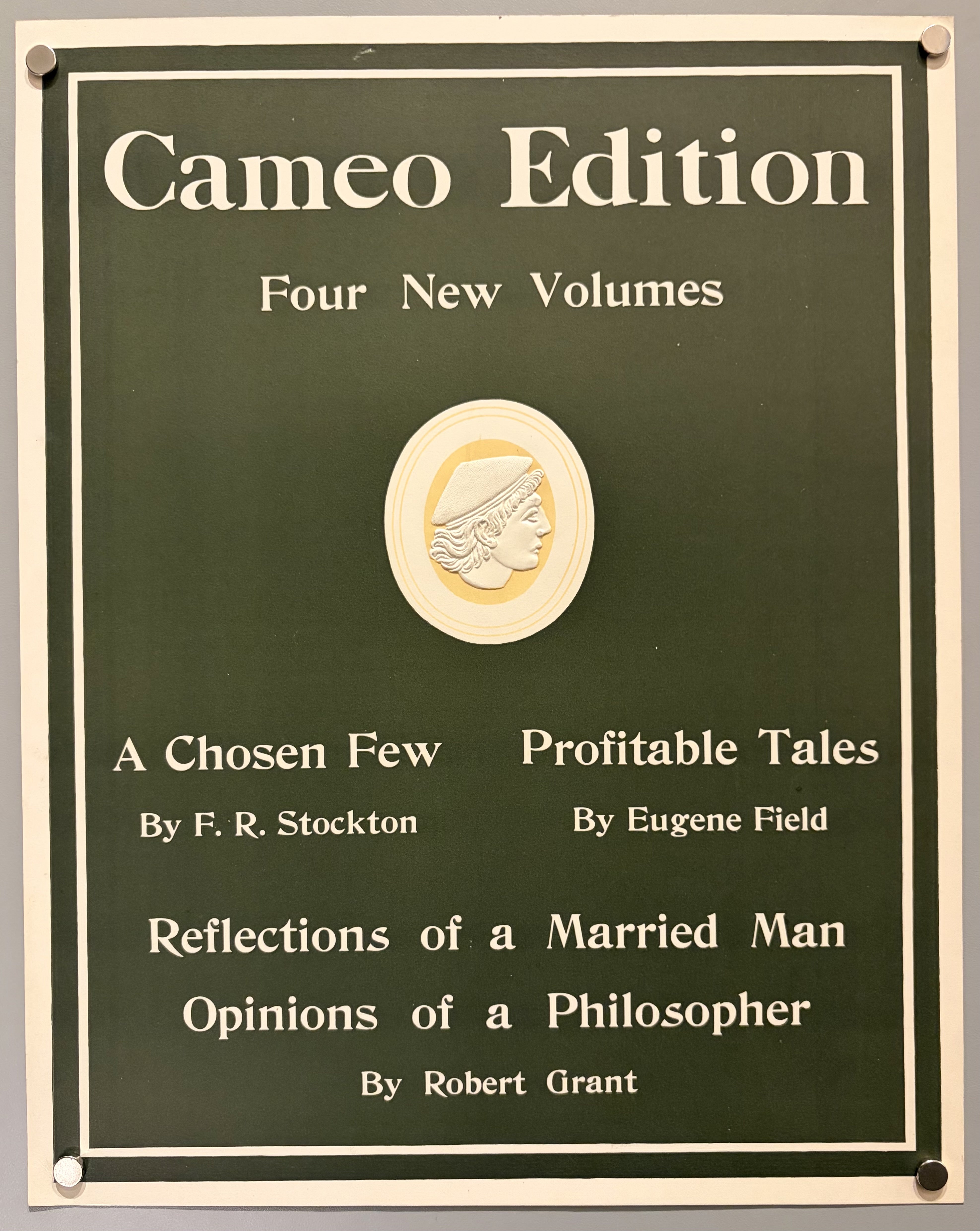"Cameo Edition / Four new volumes / A chosen Few by F.R. Stockton / Profitable tales by Eugene Field / Reflections of a Married Man/ Opinions of a Philosopherby Robert Grant"