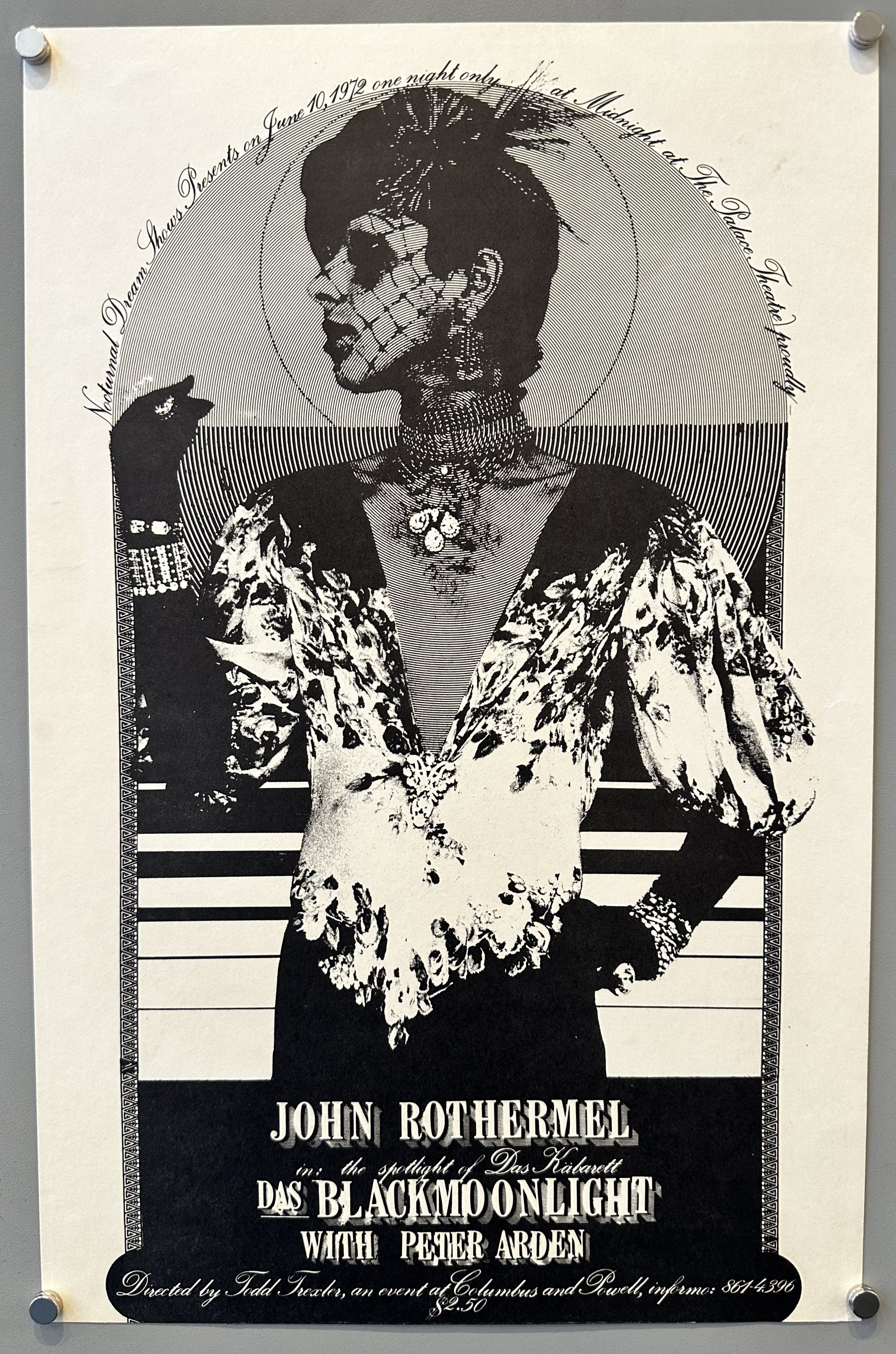 Original poster promoting John Rothermel in performance at the Palace Theatre in San Francisco California. John Rothermel, one of the Cockettes, was performing Das Black Moonlight (the spotlight of Das Kabarett), with Peter Arden at the piano. This show was presented by Nocturnal Dream Shows & was directed by Todd Trexler.