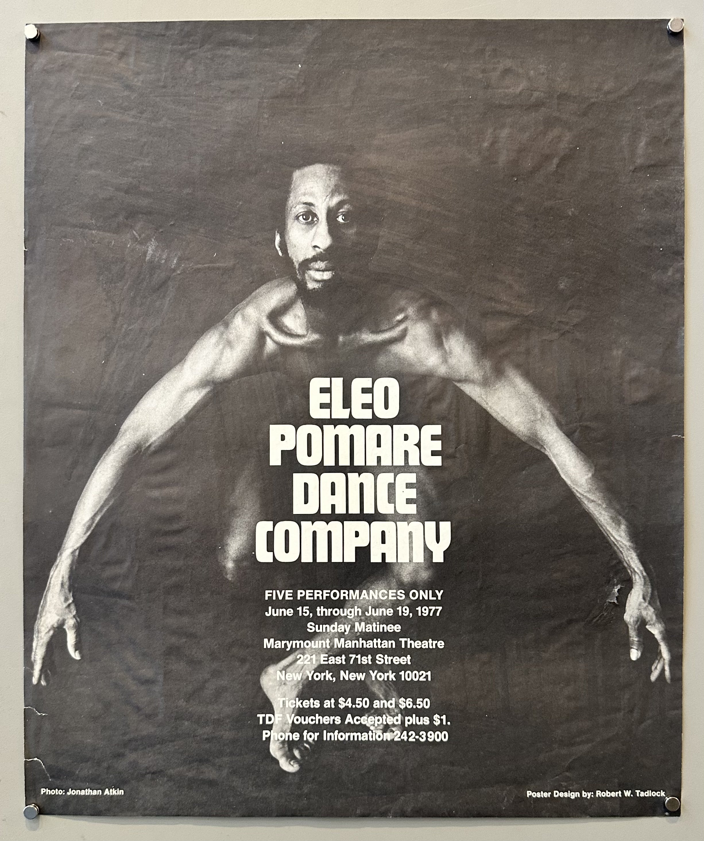 Promoting a series of performances in New York City by the Eleo Pomare Dance Company, founded by Colombian-American modern dance choreographer Eleo Pomare. Renowned for politically charged productions depicting the Black experience, Eleo Pomare was a significant figure in modern dance, using his work as activism to address social justice and racial hardship.
