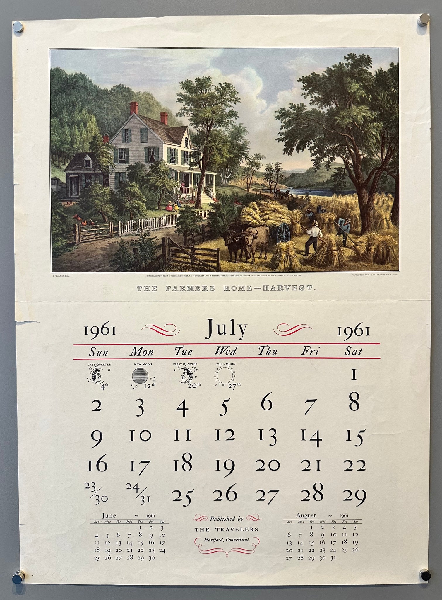 Double-sided vintage calendar from June and July 1961 featuring a painting of a lakeside scene.