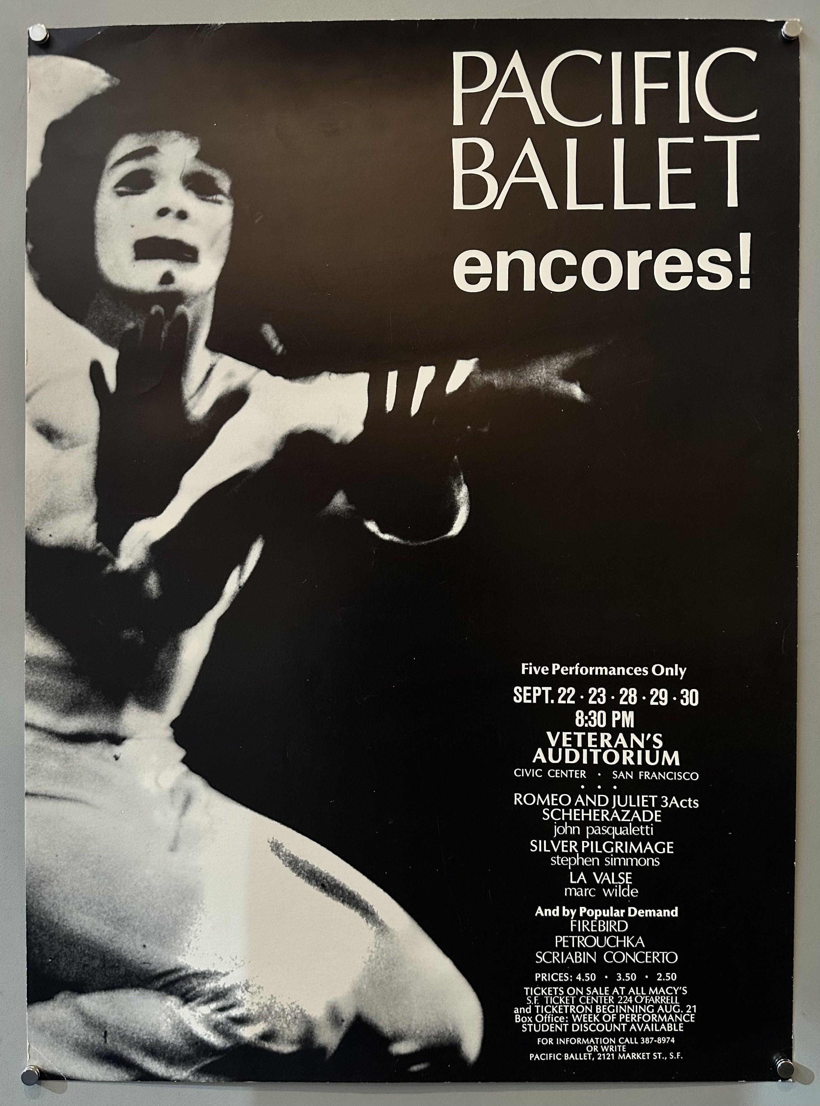 Poster promoting encore performances at the Pacific Ballet in San Francisco. Shows included Romeo and Juliet, La Valse, and Petrouchka.
