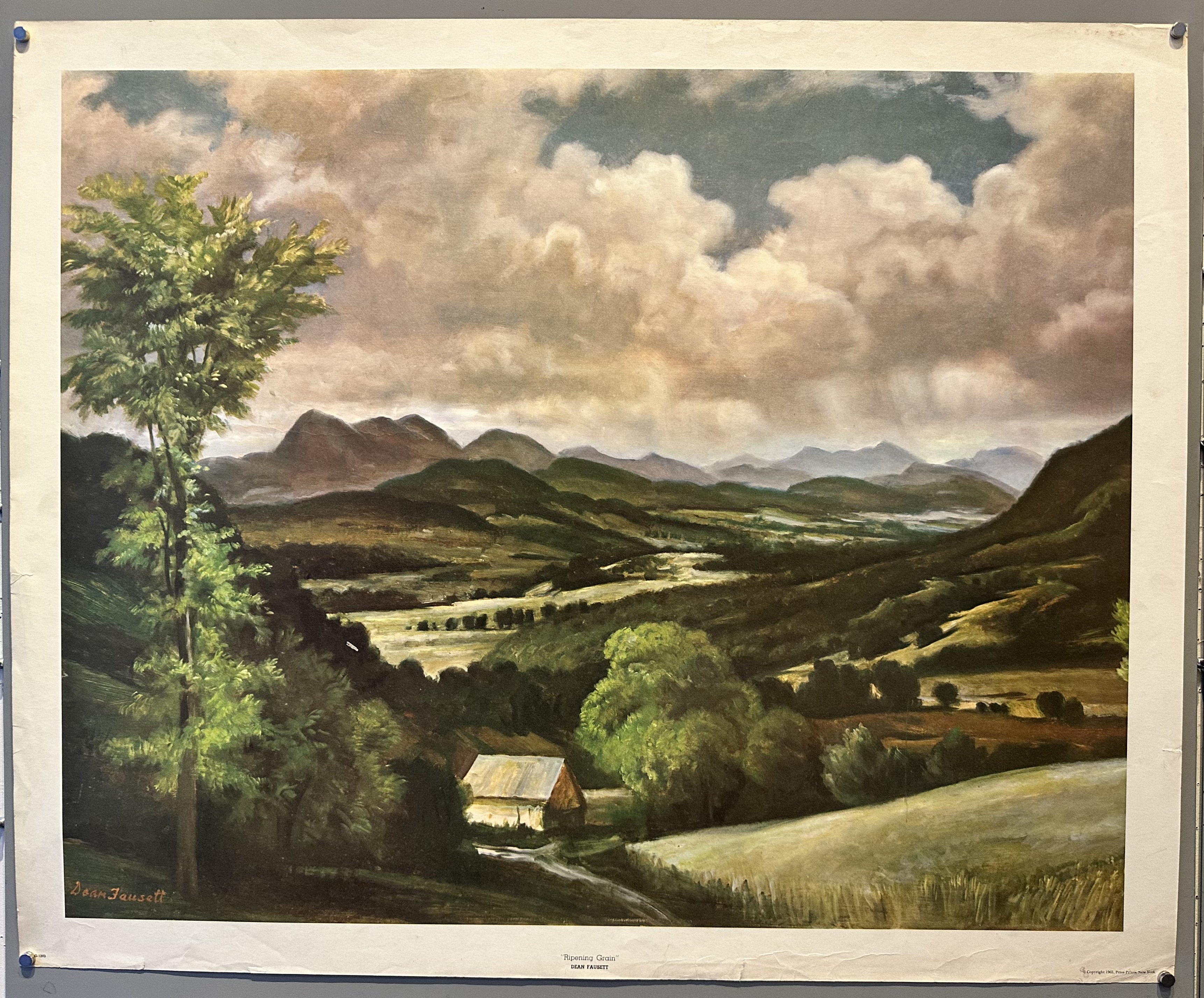 Print of a painting by Dean Fausett. Fausett was an American painter who painted romantic landscapes and portraits of notable figures like Dwight D. Eisenhower, Ronald Reagan, and the Duke and Duchess of Windsor.