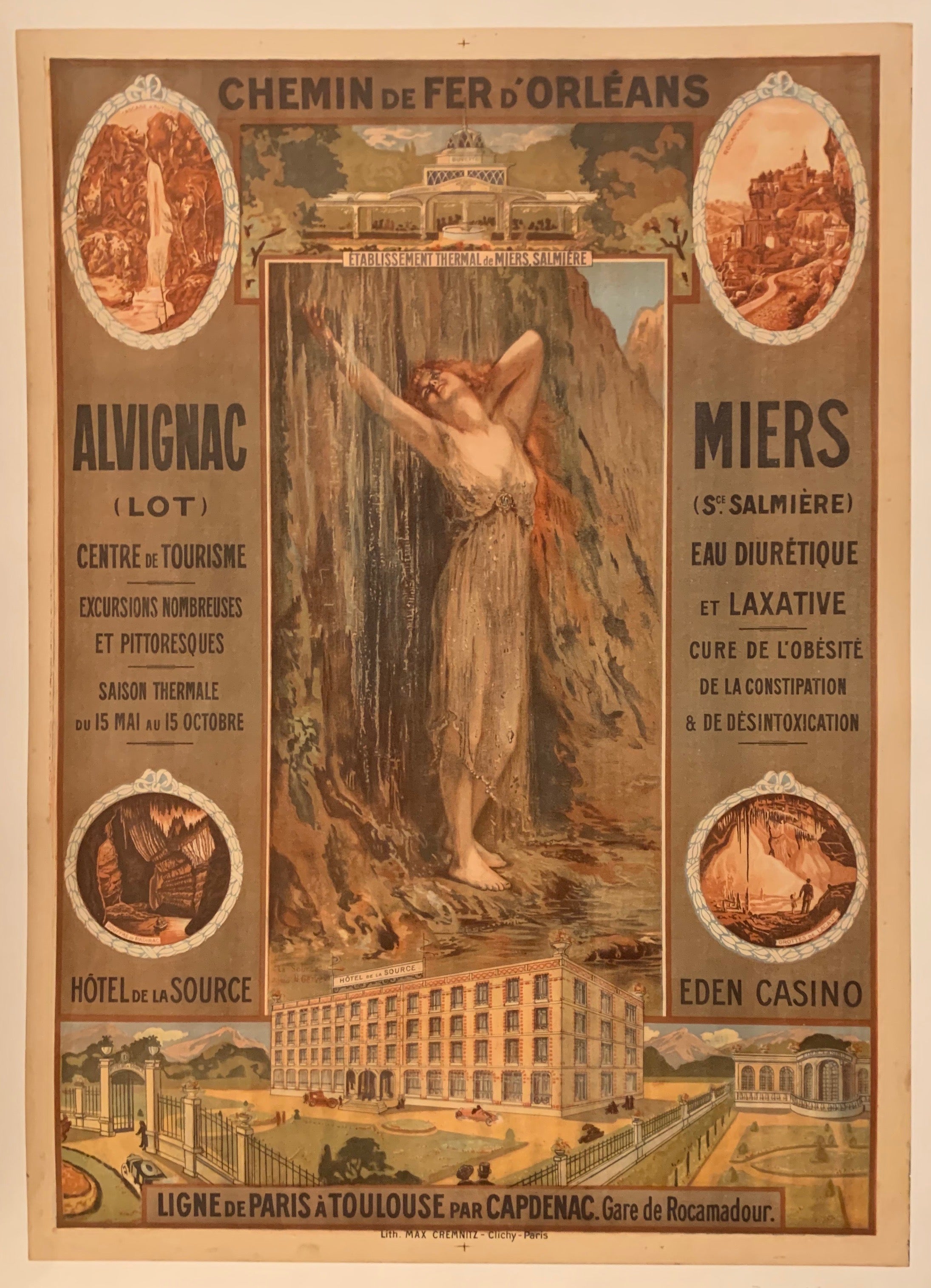 Vintage French travel poster advertising the different stops on the Orlean railroad path, like the idyllic towns of Alvignac and Miers. Illustrated in the center of the poster is a woman bathing in a waterfall, taking full advantage of all the charms the French countryside has to offer.